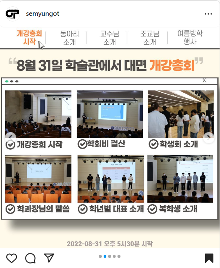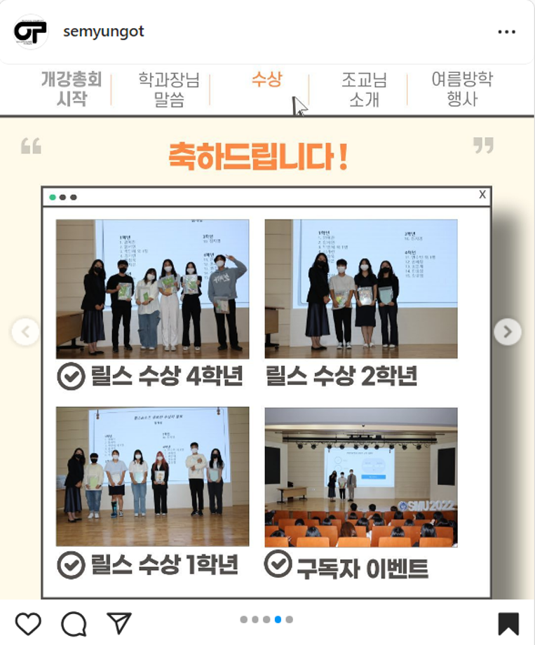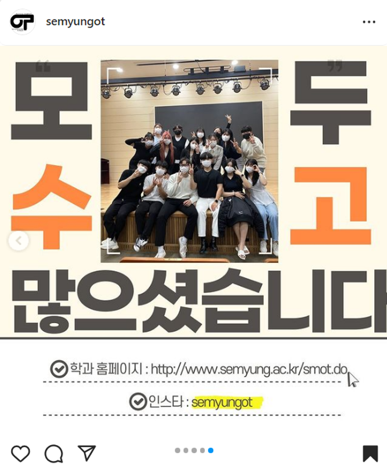본문 시작 홈으로 커뮤니티 학과소개 진로 및 취업 학과과정 커뮤니티 SNS 홈페이지가이드 학과 소식 및 행사 학과공지 학과 소식 및 행사 대학생활 엿보기 어쩌다 출근 챌린지 학생회 동아리 통학버스 시간표 학과 소식 및 행사 페이스북 트위터 프린트 2022-2학기 개강총회 작업치료학과 4318 2022-09-05 목록 이전실습모듬후기 1편 다음 2022-2학기 개강총회 사진 담당부서 : 작업치료학과 담당자 : - 연락처 : 043-649-1632 최종수정일 : 2024-10-26 만족도조사 만족도 조사 이 페이지에서 제공하는 정보에 대하여 만족하시나요? 매우만족 만족 보통 불만족 매우불만족