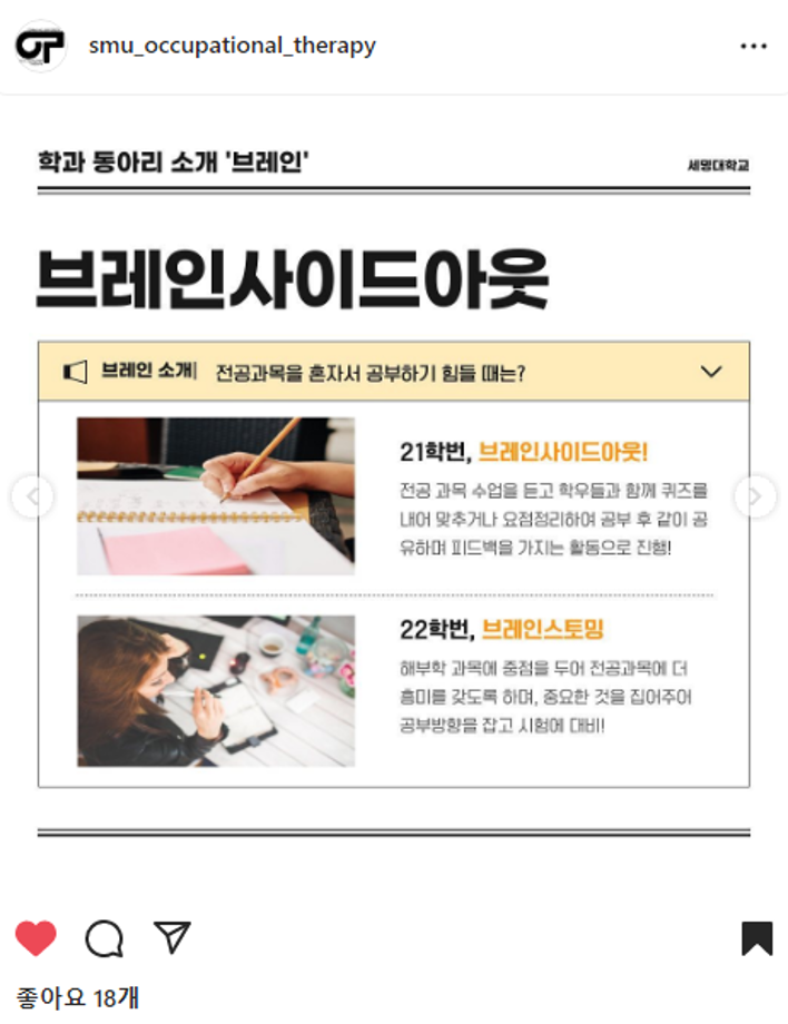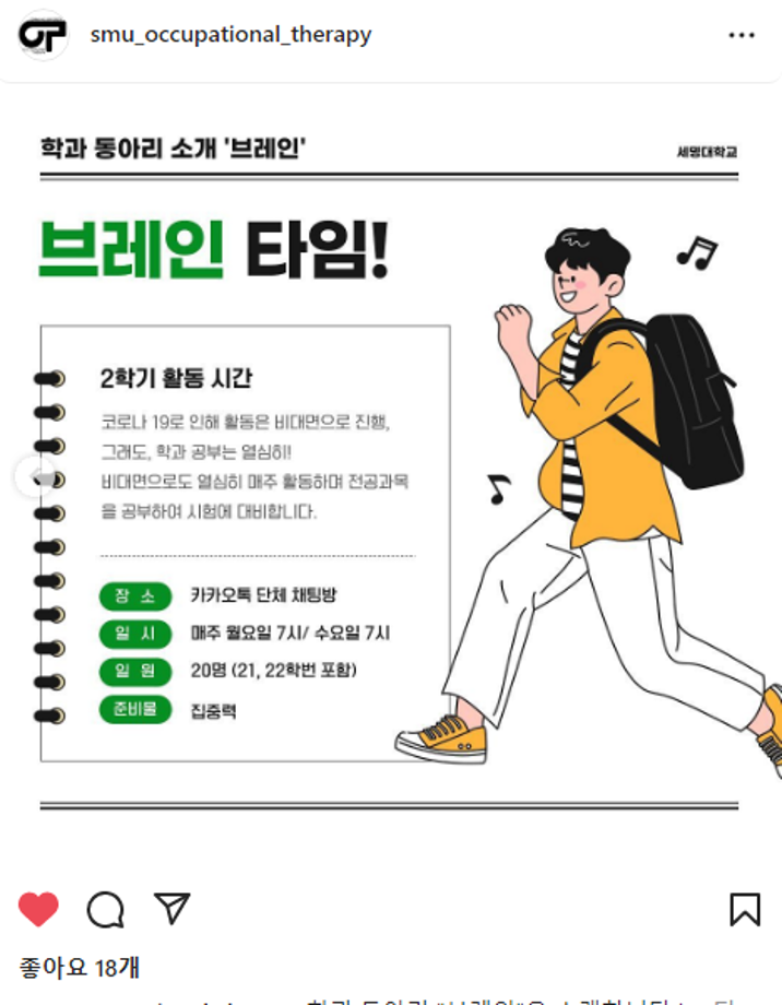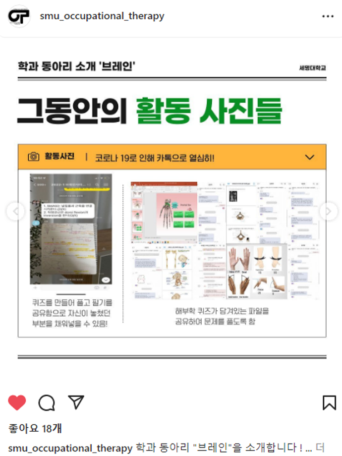본문 시작 홈으로 커뮤니티 학과소개 진로 및 취업 학과과정 커뮤니티 SNS 홈페이지가이드 학과 소식 및 행사 학과공지 학과 소식 및 행사 대학생활 엿보기 어쩌다 출근 챌린지 학생회 동아리 통학버스 시간표 학과 소식 및 행사 페이스북 트위터 프린트 동아리 소개[브레인] 작업치료학과 4507 2022-10-13 목록 이전semyung birthday cake challenge 다음 동아리 소개[세슐랭] 담당부서 : 작업치료학과 담당자 : - 연락처 : 043-649-1632 최종수정일 : 2024-10-26 만족도조사 만족도 조사 이 페이지에서 제공하는 정보에 대하여 만족하시나요? 매우만족 만족 보통 불만족 매우불만족