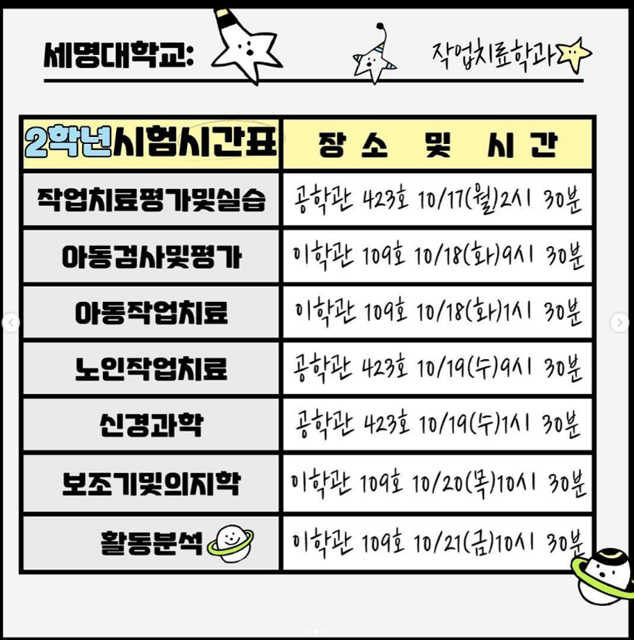 본문 시작 홈으로 커뮤니티 학과소개 진로 및 취업 학과과정 커뮤니티 SNS 홈페이지가이드 학과 소식 및 행사 학과공지 학과 소식 및 행사 대학생활 엿보기 어쩌다 출근 챌린지 학생회 동아리 통학버스 시간표 학과 소식 및 행사 페이스북 트위터 프린트 2022-2학기 중간고사 작업치료학과 4565 2022-10-17 목록 이전동아리 소개[세슐랭] 다음 동아리 소개 [9988] 담당부서 : 작업치료학과 담당자 : - 연락처 : 043-649-1632 최종수정일 : 2024-10-26 만족도조사 만족도 조사 이 페이지에서 제공하는 정보에 대하여 만족하시나요? 매우만족 만족 보통 불만족 매우불만족