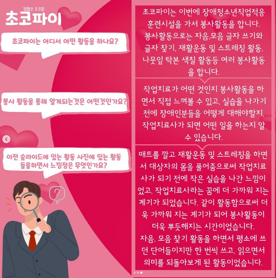 본문 시작 홈으로 커뮤니티 학과소개 진로 및 취업 학과과정 커뮤니티 SNS 홈페이지가이드 학과 소식 및 행사 학과공지 학과 소식 및 행사 대학생활 엿보기 어쩌다 출근 챌린지 학생회 동아리 통학버스 시간표 학과 소식 및 행사 페이스북 트위터 프린트 동아리 소개 [초코파이] 작업치료학과 4504 2022-10-26 목록 이전동아리 소개 [9988] 다음 2022 실습후기모음 (아동파트 대학병원, 종합병원) 담당부서 : 작업치료학과 담당자 : - 연락처 : 043-649-1632 최종수정일 : 2024-10-26 만족도조사 만족도 조사 이 페이지에서 제공하는 정보에 대하여 만족하시나요? 매우만족 만족 보통 불만족 매우불만족