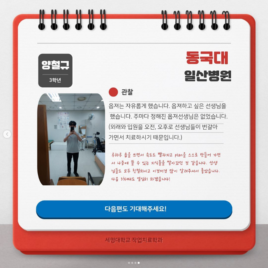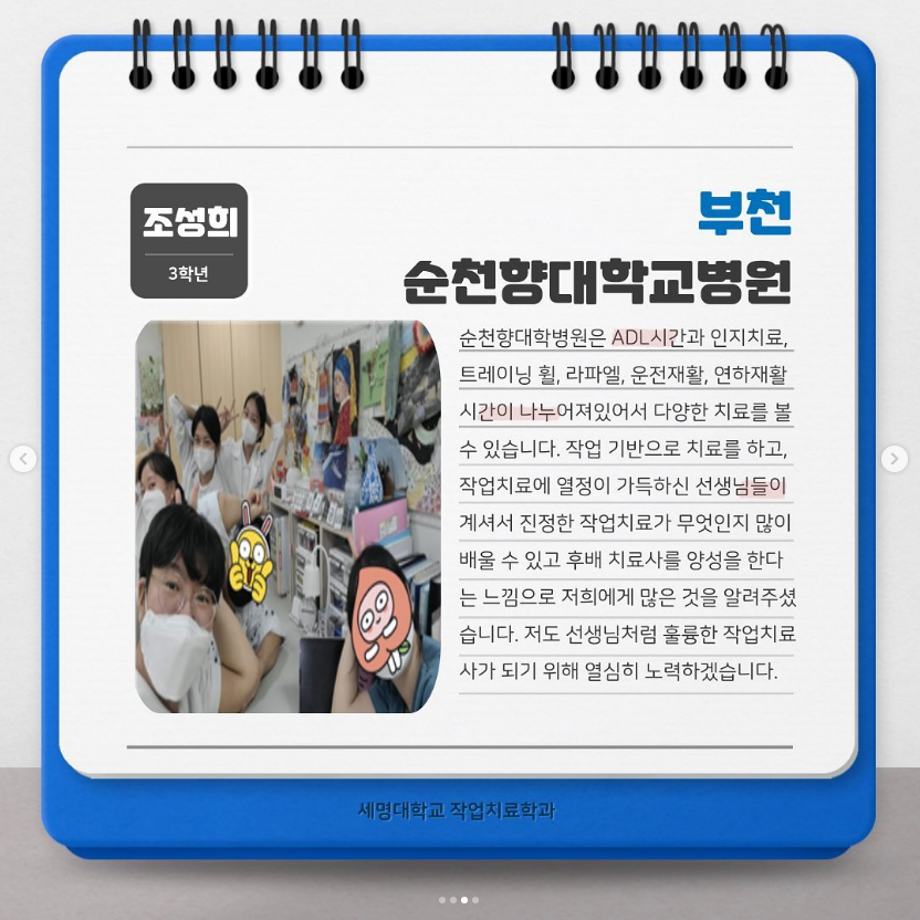 본문 시작 홈으로 커뮤니티 학과소개 진로 및 취업 학과과정 커뮤니티 SNS 홈페이지가이드 학과 소식 및 행사 학과공지 학과 소식 및 행사 대학생활 엿보기 어쩌다 출근 챌린지 학생회 동아리 통학버스 시간표 학과 소식 및 행사 페이스북 트위터 프린트 2022 실습후기모음 (아동파트 대학병원, 종합병원) 작업치료학과 4742 2022-11-01 목록 이전동아리 소개 [초코파이] 다음 동아리 소개 [지태사] 담당부서 : 작업치료학과 담당자 : - 연락처 : 043-649-1632 최종수정일 : 2024-10-26 만족도조사 만족도 조사 이 페이지에서 제공하는 정보에 대하여 만족하시나요? 매우만족 만족 보통 불만족 매우불만족