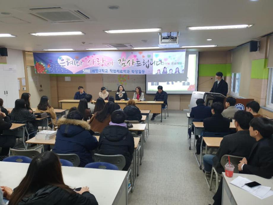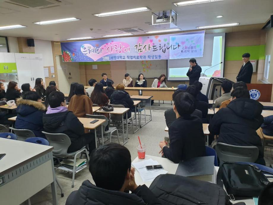 본문 시작 홈으로 커뮤니티 학과소개 진로 및 취업 학과과정 커뮤니티 SNS 홈페이지가이드 학과 소식 및 행사 학과공지 학과 소식 및 행사 대학생활 엿보기 어쩌다 출근 챌린지 학생회 동아리 통학버스 시간표 학과 소식 및 행사 페이스북 트위터 프린트 2018년도 사은회 작업치료학과 7067 2018-12-10 12월 10일, 작업치료사 국가시험을 보고 돌아온 4학년 학생들이 교수님들을 모시고 사은회를 진행하였습니다. 사은회는 과대표 학생의 편지 낭독, 그동안 교수님들께 궁금했던 질문들, 마지막으로 4학년 학생들에게 하고 싶은 교수님의 말씀 순으로 진행하였습니다. 4학년 학생들이 졸업하기 전 교수님들과 거리감 없이 함께 나눌 수 있는 좋은 시간이었습니다. 그동안 많은 가르침을 주신 스승의 은혜를 잊지 않겠습니다. 감사합니다. 목록 이전제46회 작업치료사 국가시험 다음 2018 임상실습 간담회 담당부서 : 작업치료학과 담당자 : - 연락처 : 043-649-1632 최종수정일 : 2024-10-26 만족도조사 만족도 조사 이 페이지에서 제공하는 정보에 대하여 만족하시나요? 매우만족 만족 보통 불만족 매우불만족