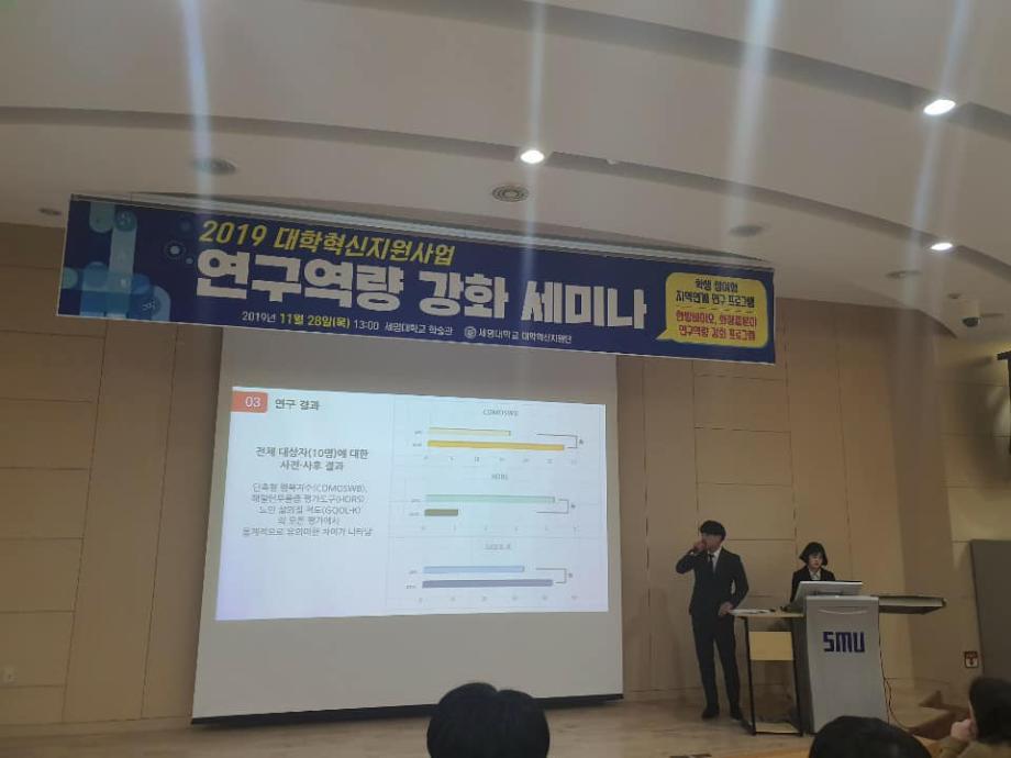 11월 28일 세명대학교 작업치료학과는 김환희교수님 지도아래 4학년(유연수, 도하연, 박소진, 안소현, 이수미, 임주희)과 1학년(권세정, 김보미, 이채원, 최현희)이 협동하여 [학생참여연구]를 수행하였다. 본 연구는 대학혁신지원사업의 일환인 학생참여형 지역연계 연구 프로그램으로 제천시노인복지관과 협력하여 진행되었다. 작업치료학과 [부모님께 효돌하자!]팀의 연구 목적은 사물인터넷(lot) 기반의 스마트 반려인형(효돌이)을 사용하여 제천시에 거주하는 노인의 돌봄체계를 지원하는 것이었다. 지역사회 어르신에게도 인정받고 연구의 긍정적인 효과가 두드러지게 나타났으며, 세명대학교에서 시행된 연구 성과 발표회에서는 최우상을 수상하는 영광을 받았다. 앞으로도 세명대학교 작업치료학과 학생들은 전공수업을 통해 배운 작업치료 지식을 직접 적용해 봄으로써 미래 작업치료사로서의 참(CHARM) 역량을 키우는 계기가 확대 될 것이다.