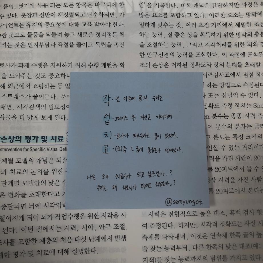 본문 시작 홈으로 커뮤니티 학과소개 진로 및 취업 학과과정 커뮤니티 SNS 홈페이지가이드 학과 소식 및 행사 학과공지 학과 소식 및 행사 대학생활 엿보기 어쩌다 출근 챌린지 학생회 동아리 통학버스 시간표 학과 소식 및 행사 페이스북 트위터 프린트 작업치료 4행시 콘테스트 작업치료학과 7778 2020-06-16 많은 사람에게 작업치료가 무엇인지 알리고, 대중화되길 바라는 마음으로 "작업치료"로 4행시 콘테스트를 진행하게 되었습니다. 4행시 콘데스트로 단순히 작업치료를 알릴 뿐만 아니라, 작업치료학과 학생으로서 한 번 더 생각해보고 자아 성찰하는 시간을 갖게 된 것 같습니다. 목록 이전2020학년도 온라인강의 실시 다음 마스크 인증샷 챌린지 담당부서 : 작업치료학과 담당자 : - 연락처 : 043-649-1632 최종수정일 : 2024-10-26 만족도조사 만족도 조사 이 페이지에서 제공하는 정보에 대하여 만족하시나요? 매우만족 만족 보통 불만족 매우불만족
