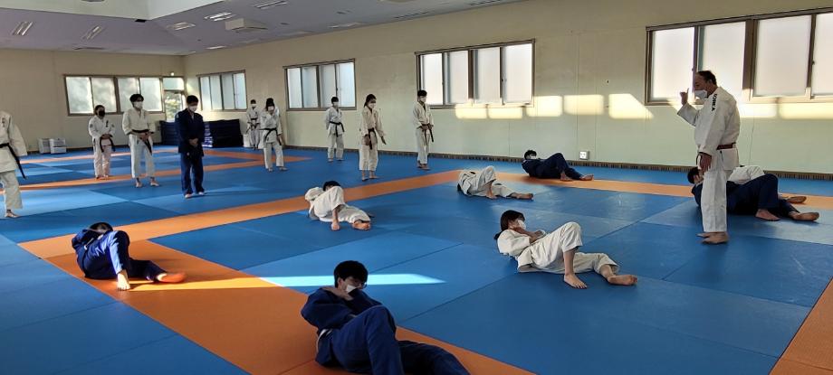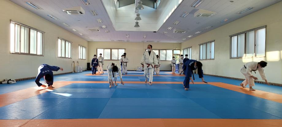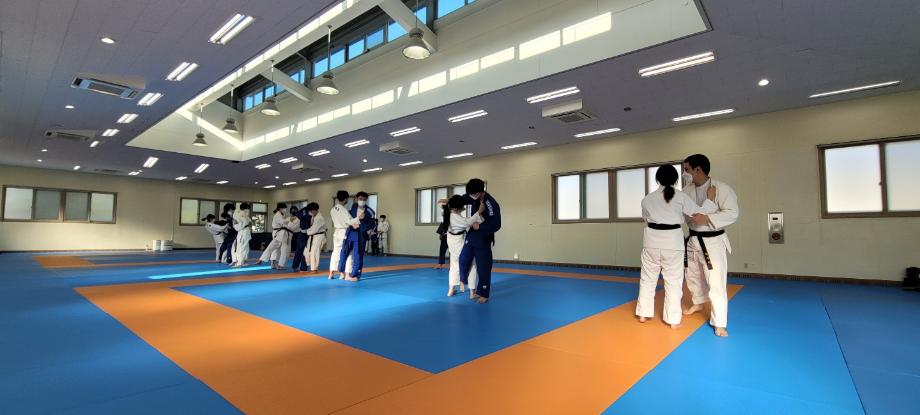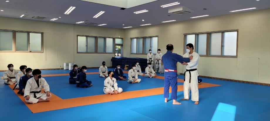 쾌적한 유도동아리 동방에서 선배가 후배들에게 운동을 가르쳐주고, 특강 및 무술 수업을
