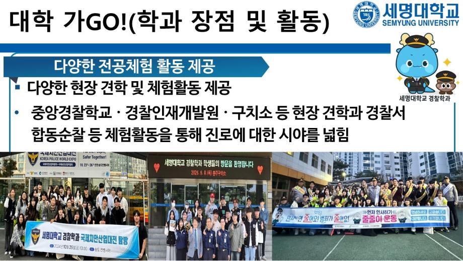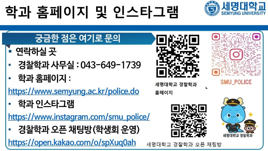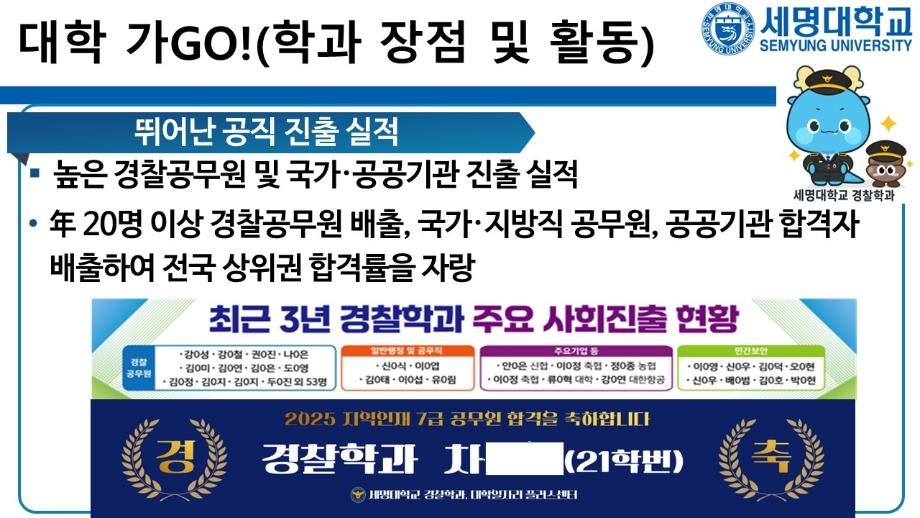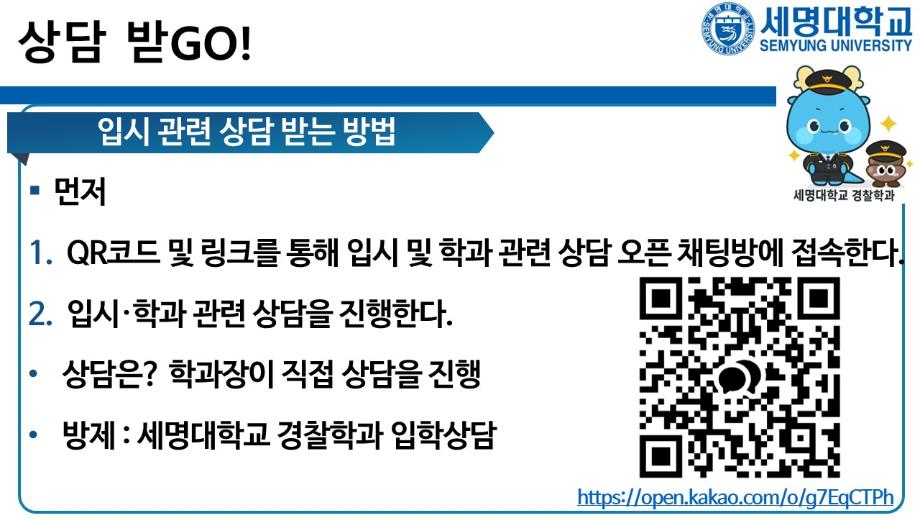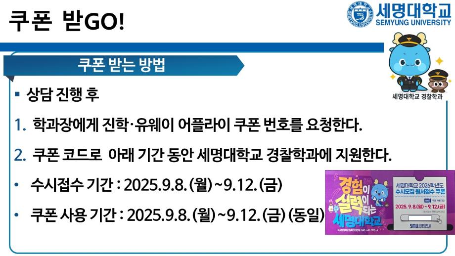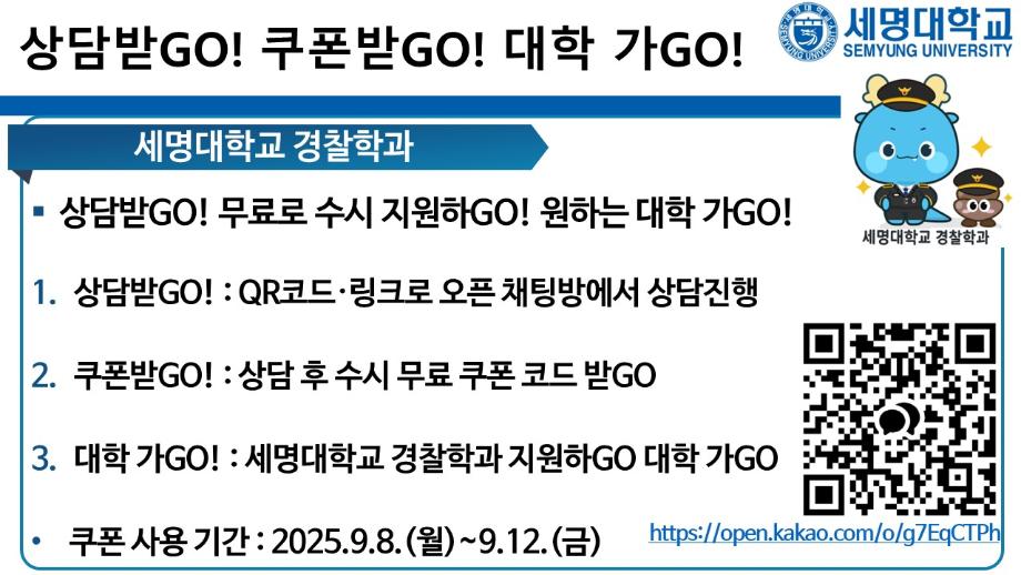 본문 시작 홈으로 커뮤니티 학과소개 교수소개 학과과정 커뮤니티 홈페이지가이드 포토갤러리 학부공지 학과일정 포토갤러리 학생회 동아리 포토갤러리 페이스북 트위터 프린트 상담받고GO! 쿠폰받GO! 무료로 대학 지원하GO! 경찰학과 1996 2025-09-05 세명대학교 경찰학과 2026학년도 수시 지원 상담받GO! 쿠폰 받GO! 무료로 대학 지원하GO! 상담받GO! : 먼저 QR코드·링크로 오픈 채팅방에서 상담받GO 쿠폰받GO! : 상담 후 수시 무료 쿠폰 코드 받GO 무료로 대학지원하GO! : 세명대학교 경찰학과 지원하GO 사용처 : 진학어플라이, 유웨이어플라이 쿠폰 사용 기간 : 2025.9.8.(월)~9.12.(금) 세명대학교 경찰학과 2026학년도 수시 모집에 많은 관심 부탁드립니다. 목록 이전2025학년도 하계 방학 중 본교 편의시설 운영 안내 다음 해외 취업사기 범죄예방교육 만족도조사 만족도 조사 이 페이지에서 제공하는 정보에 대하여 만족하시나요? 매우만족 만족 보통 불만족 매우불만족