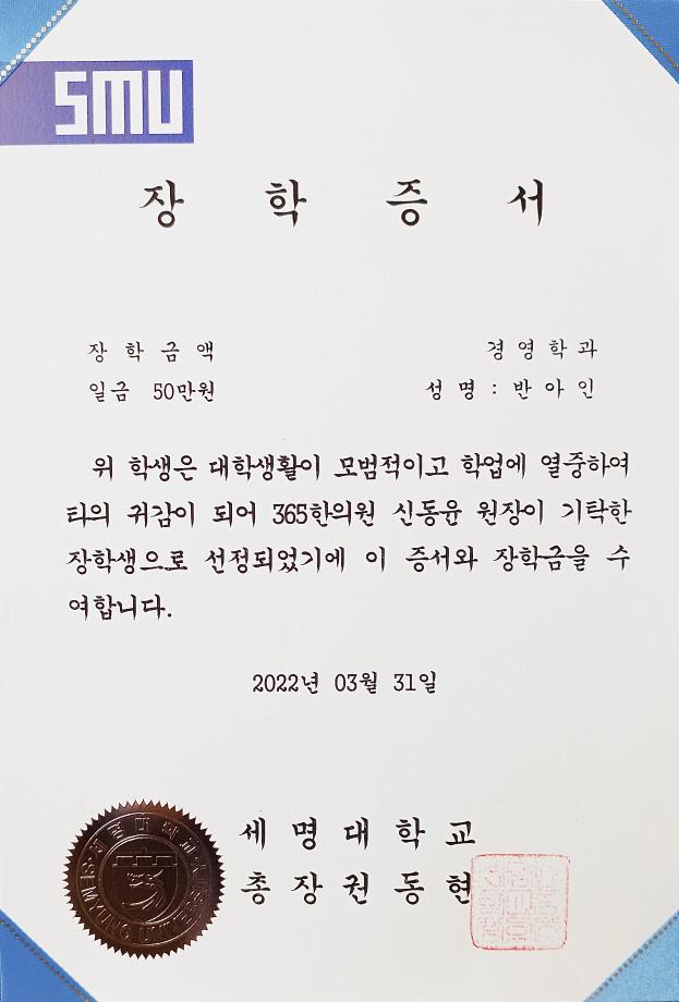 본문 시작 홈으로 커뮤니티 학과소개 학생진로 교과과정 커뮤니티 학과 SNS 홈페이지가이드 학과 갤러리 공지사항 대학원 학과 갤러리 학과 이야기 동아리 학생회 학과 갤러리 페이스북 트위터 프린트 경영학과 20학번 반아인 장학생 경영학과 2583 2022-04-06 03월 31일, 경영학과 20학번 반아인 학생은 학업성적이 우수하고 성실한 학과 생활로 타의 귀감이 되어 365한의원 신동윤 대표원장이 기탁한 장학생으로 선정되었으며 장학금 기탁 및 장학증서 수여식에 참석하였습니다. 목록 이전사회 새내기의 필수 역량 강화 다음 2022 경영학과 체육대회 담당부서 : 경영학과 담당자 : - 연락처 : 043-649-1766 최종수정일 : 2024-10-26 만족도조사 만족도 조사 이 페이지에서 제공하는 정보에 대하여 만족하시나요? 매우만족 만족 보통 불만족 매우불만족