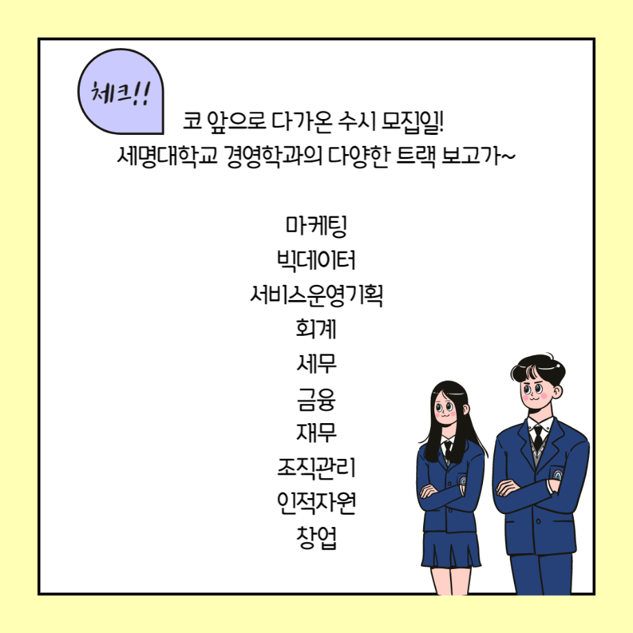 본문 시작 홈으로 커뮤니티 학과소개 학생진로 교과과정 커뮤니티 학과 SNS 홈페이지가이드 학과 갤러리 공지사항 대학원 학과 갤러리 학과 이야기 동아리 학생회 학과 갤러리 페이스북 트위터 프린트 2023학년도 경영학과 수시모집!! 경영학과 3267 2022-09-13 안녕하세요, 세명대학교 경영학과 홍보단 ‘은가비’입니다😎 2023학년도 수시 모집 기간이 하루 앞으로 다가왔습니다!! 다양한 트랙에서 실무형 인재 & 스마트 리더를 양성하는 세명대학교 경영학과!! 많은 관심과 지원 부탁드리며, 여러분을 응원하겠습니다. 우리 내년에 캠퍼스에서 만나요~💙 목록 이전경영학과 장학금 수여식 (feat. 최건동 교수님) 다음 제 6회 사회과학대학 토론대회 개최 담당부서 : 경영학과 담당자 : - 연락처 : 043-649-1766 최종수정일 : 2024-10-26 만족도조사 만족도 조사 이 페이지에서 제공하는 정보에 대하여 만족하시나요? 매우만족 만족 보통 불만족 매우불만족