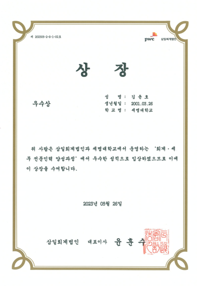 본문 시작 홈으로 커뮤니티 학과소개 학생진로 교과과정 커뮤니티 학과 SNS 홈페이지가이드 학과 갤러리 공지사항 대학원 학과 갤러리 학과 이야기 동아리 학생회 학과 갤러리 페이스북 트위터 프린트 [경영학과] 김서희, 김윤호 학생 삼일회계법인 대표이사상 수상 경영학과 2578 2024-02-28 삼일회계법인과 세명대학교에서 운영하는 삼일회계법인 주문식교육프로그램인 “회계세무전문인력 양성과정”의 회계관리 2급 자격증 분야에서 최우수상-23학번 김서희 학생 / 우수상-20학번 김윤호 학생이 우수한 성적으로 입상하여 상장을 수여하였다. 목록 이전[경영학과] 경영디너쇼 다음 [경영학과] 2024학년도 신입생 환영 영상 담당부서 : 경영학과 담당자 : - 연락처 : 043-649-1766 최종수정일 : 2024-10-26 만족도조사 만족도 조사 이 페이지에서 제공하는 정보에 대하여 만족하시나요? 매우만족 만족 보통 불만족 매우불만족