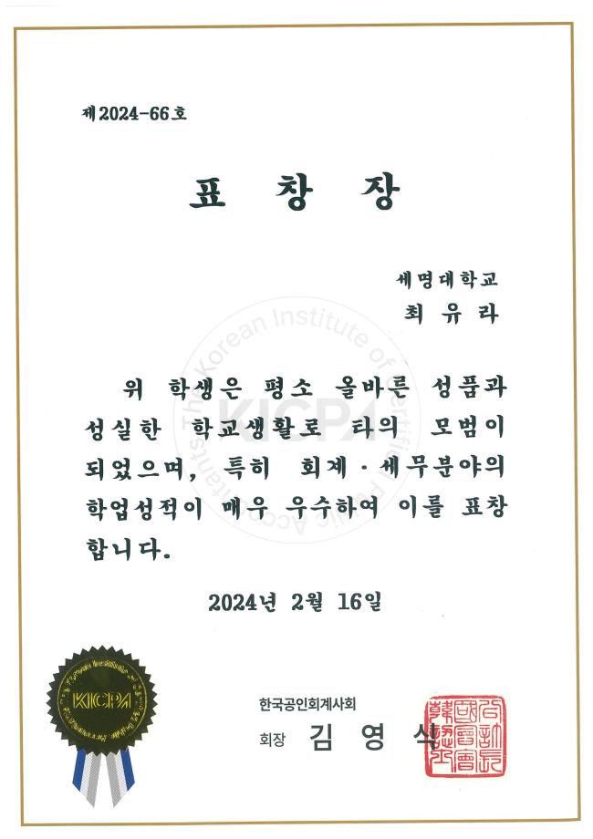 본문 시작 홈으로 커뮤니티 학과소개 학생진로 교과과정 커뮤니티 학과 SNS 홈페이지가이드 학과 갤러리 공지사항 대학원 학과 갤러리 학과 이야기 동아리 학생회 학과 갤러리 페이스북 트위터 프린트 [경영학과] 이유진, 최유라 학생 한국공인회계사회장 표창 경영학과 2641 2024-02-29 2024년도 졸업생 중 성적이 우수하며 AT자격(FAT, TAT)소지자인 “이유진(19학번)” “최유라(19학번)” 대하여 표창 및 부상을 시상하였다. 목록 이전[경영학과] 2024학년도 신입생 환영 영상 다음 [경영학과] 제 30회 경영학과 학위수여식 담당부서 : 경영학과 담당자 : - 연락처 : 043-649-1766 최종수정일 : 2024-10-26 만족도조사 만족도 조사 이 페이지에서 제공하는 정보에 대하여 만족하시나요? 매우만족 만족 보통 불만족 매우불만족