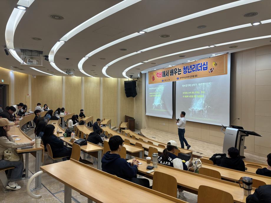 본문 시작 홈으로 커뮤니티 학과소개 학생진로 교과과정 커뮤니티 학과 SNS 홈페이지가이드 학과 갤러리 공지사항 대학원 학과 갤러리 학과 이야기 동아리 학생회 학과 갤러리 페이스북 트위터 프린트 [경영학과] 김익철 하카리더십코리아 대표 학술특강 경영학과 1584 2025-04-30 4월 30일에 [김익철 하카리더십코리아 대표의 “럭비에서 배우는 청년 리더십”] 경영학술특강이 진행되었습니다. 참여한 학생들에게 동기부여를 전하는 뜻깊은 시간이었습니다. 목록 이전[일반대학원 경영학과] 논문토론회 개최 다음 [경영학과] AI를 활용한 경영학과 홍보 콘텐츠 공모전 담당부서 : 경영학과 담당자 : - 연락처 : 043-649-1766 최종수정일 : 2024-10-26 만족도조사 만족도 조사 이 페이지에서 제공하는 정보에 대하여 만족하시나요? 매우만족 만족 보통 불만족 매우불만족