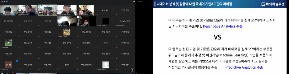 본문 시작 홈으로 커뮤니티 학과소개 학생진로 교과과정 커뮤니티 학과 SNS 홈페이지가이드 학과 갤러리 공지사항 대학원 학과 갤러리 학과 이야기 동아리 학생회 학과 갤러리 페이스북 트위터 프린트 경영학과 학술특강: 빅데이터와 예측분석. 무엇을 예측하고 어떻게 활용할 것인가? 경영학과 4395 2021-05-20 5월 20일 (목요일) 오전 10:30. 경영학과 학술 특강으로 데이터솔루션 정성원 상무님꼐서 빅데이터와 예측분석. 무엇을 예측하고 어떻게 활용할 것인가? 에 대해 특강을 해주셨습니다. 54명의 교수, 학생들이 참여하여 온라인(zoom)에서 안전하게 진행되었습니다. 4차 산업시대 빅데이터 활용을 위해 학생들에게 필요한 실무적 지식과 역량을 알아보는 뜻깊은 시간이었습니다. 목록 이전신입생 환영회 및 경영학과 행사 다음 2021 고교특강 (제천제일고) 담당부서 : 경영학과 담당자 : - 연락처 : 043-649-1766 최종수정일 : 2024-10-26 만족도조사 만족도 조사 이 페이지에서 제공하는 정보에 대하여 만족하시나요? 매우만족 만족 보통 불만족 매우불만족