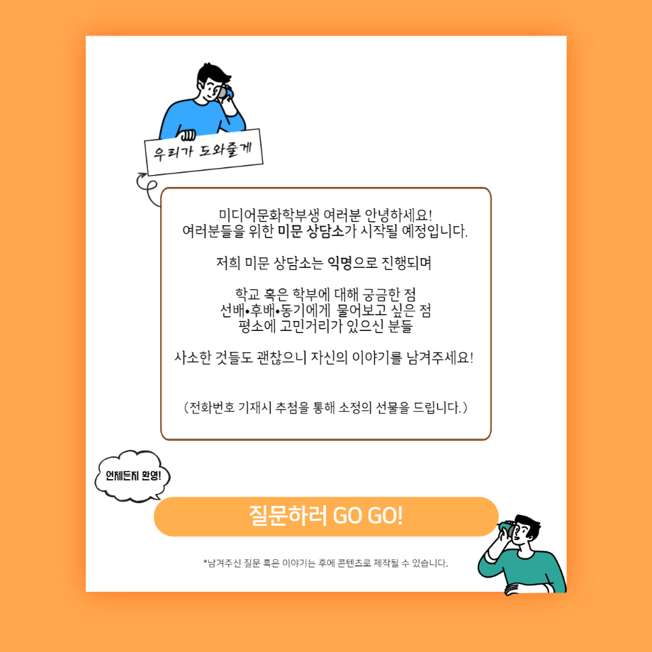 본문 시작 홈으로 커뮤니티 학부소개 교육과정 학부소식 커뮤니티 홈페이지가이드 학생회 학생회 동아리 자료실 장비대여 자유게시판 학생회 페이스북 트위터 프린트 [학생회 활동] 미문상담소 학생회 3239 2022-04-30 미디어문화학부생 여러분 안녕하세요! 미문 상담소에 대해 안내드립니다😊 학부에 대해 궁금한 점, 선배•후배•동기에게 물어보고 싶은 점, 자신의 고민 등 사소한 것들도 괜찮으니 자신의 이야기를 남겨주세요! 익명으로 진행되므로 편하게 작성해주세요 :) *남겨주신 질문 혹은 이야기는 후에 콘텐츠로 제작될 수 있습니다! (전화번호를 남겨주실 경우, 추첨을 통해 소정의 선물을 드릴 예정입니다.) https://naver.me/5okYea3H 목록 이전[학생회 활동] 2021-2 응원 간식 포장 다음 [학생회 활동] 2022년 1학기 선.사.친 활동 중간보고 담당부서 : 미디어문화학부 담당자 : - 연락처 : 043-649-1760 최종수정일 : 2024-10-26 만족도조사 만족도 조사 이 페이지에서 제공하는 정보에 대하여 만족하시나요? 매우만족 만족 보통 불만족 매우불만족