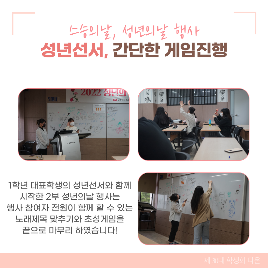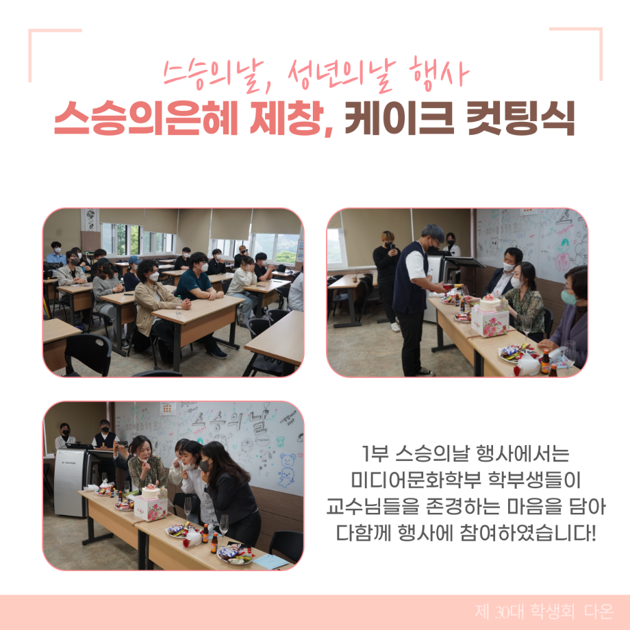 본문 시작 홈으로 커뮤니티 학부소개 교육과정 학부소식 커뮤니티 홈페이지가이드 학생회 학생회 동아리 자료실 장비대여 자유게시판 학생회 페이스북 트위터 프린트 [학생회 활동] 스승의날, 성년의날 행사 되돌아보기 학생회 3286 2022-05-20 지난 5월13일에 미디어문화학부 스승의날과 성년의날 행사가 있었습니다! 행사 진행과정을 한번 살펴볼까요? 1부 스승의날 행사에서는 미디어문화학부 학부생들이 교수님들을 존경하는 마음을 담아 다함께 행사에 참여하였습니다! 1학년 대표학생의 성년선서와 함께 시작한 2부 성년의날 행사는 행사 참여자 전원이 함께 할 수 있는노래제목 맞추기와 초성게임을 끝으로 마무리 하였습니다! 목록 이전미디어문화학부 전공 체험 - 제천제일고 다음 🏆미디어문화학부 학생회, 2022 E-sports 대회 : 인문예술리그 개최🏆 담당부서 : 미디어문화학부 담당자 : - 연락처 : 043-649-1760 최종수정일 : 2024-10-26 만족도조사 만족도 조사 이 페이지에서 제공하는 정보에 대하여 만족하시나요? 매우만족 만족 보통 불만족 매우불만족