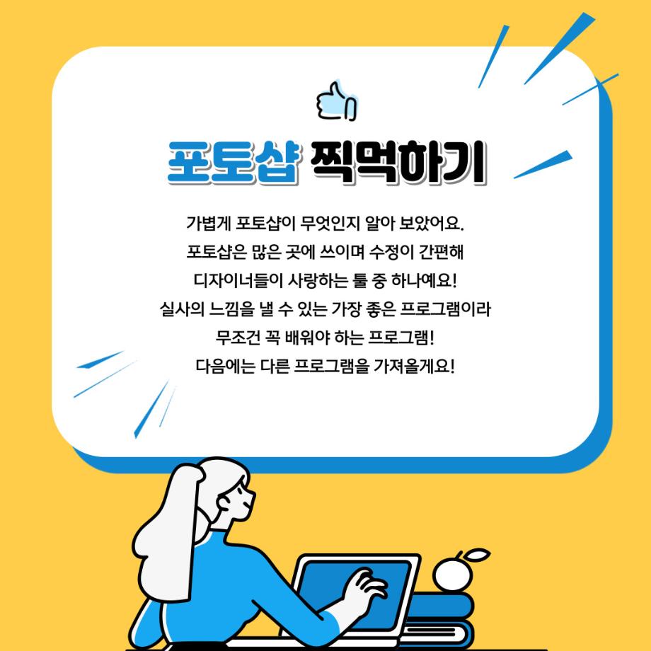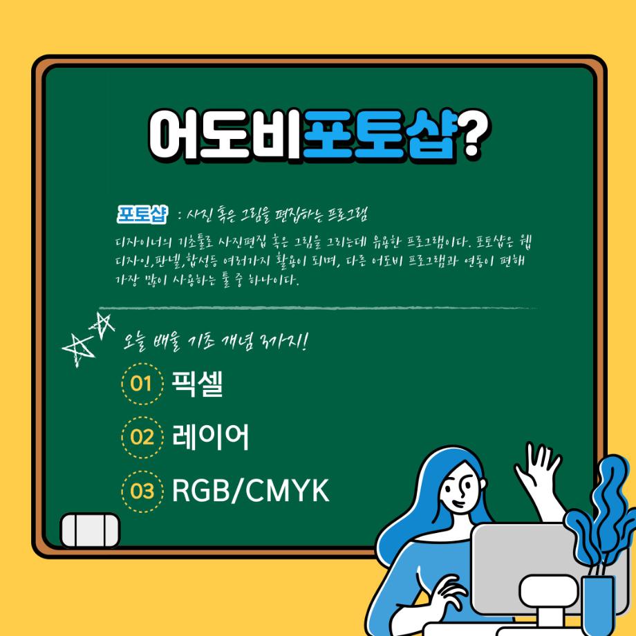 본문 시작 홈으로 학과자랑 학과소개 학과과정 시영소식 입학/취업 AI 학과자랑 SNS소통 홈페이지가이드 갤러리 학과자랑 갤러리 공모전 동아리 졸업전시회 갤러리 페이스북 트위터 프린트 예비 대학생을 위한 디자인 프로그램 설명 2탄 (포토샵) 시각영상디자인학과 2317 2022-02-07 1학년때 배우는 디자인 툴 포토샵입니다. 목록 이전예비 대학생을 위한 디자인 프로그램 설명 1탄 (일러스트레이터) 다음 예비 대학생을 위한 디자인 프로그램 설명 3탄 (애프터이펙트) 담당부서 : 시각영상디자인학과 담당자 : - 연락처 : 043-649-1726 최종수정일 : 2024-10-26 만족도조사 만족도 조사 이 페이지에서 제공하는 정보에 대하여 만족하시나요? 매우만족 만족 보통 불만족 매우불만족