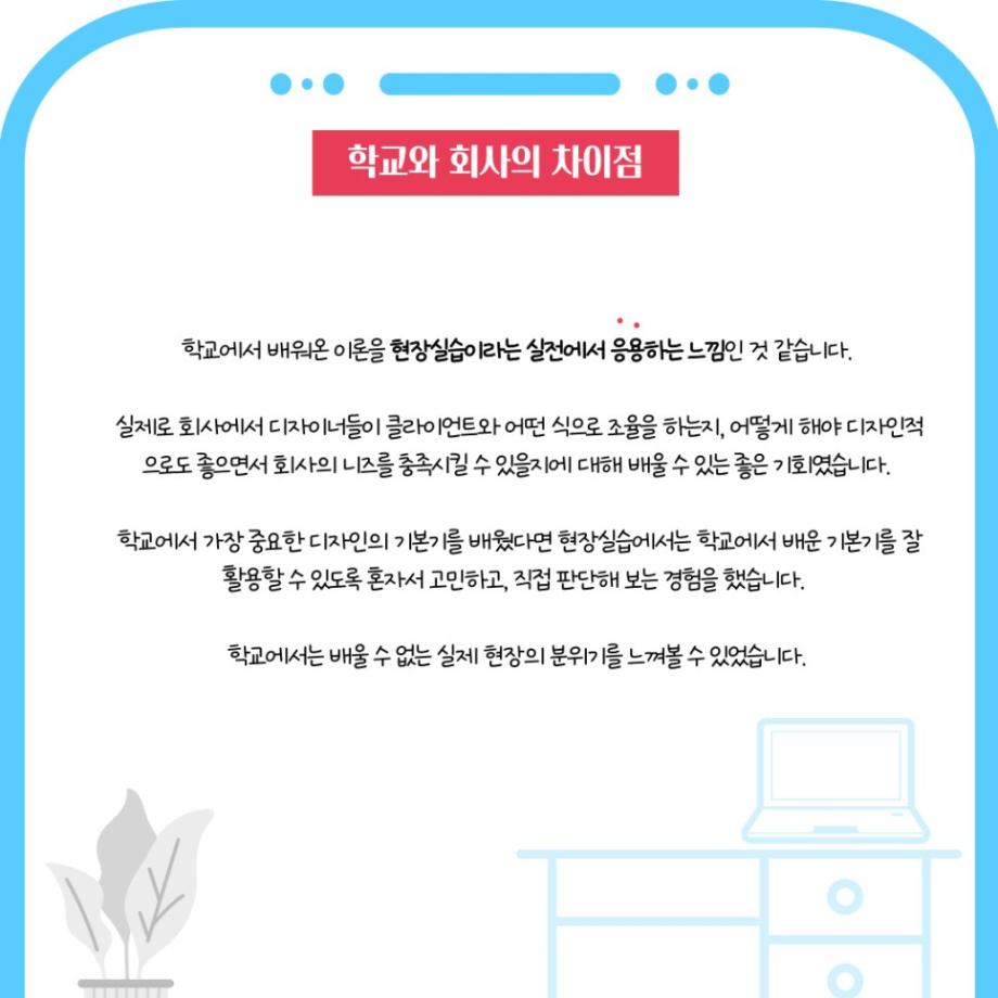 본문 시작 홈으로 학과자랑 학과소개 학과과정 시영소식 입학/취업 AI 학과자랑 SNS소통 홈페이지가이드 갤러리 학과자랑 갤러리 공모전 동아리 졸업전시회 갤러리 페이스북 트위터 프린트 2022년 여름방학 현장실습 알아보기! 2탄 시각영상디자인학과 4736 2022-08-03 2022년 여름방학 현장실습 알아보기! 2탄 유튜브 링크 https://www.youtube.com/watch?v=4CEG3-eYjWE&t=25s [출처] 2022년 여름방학 현장실습 알아보기! 2탄|작성자 세명대학교시각영상 목록 이전세명대학교 시각영상디자인 학생들의 현장실습 1탄 다음 세명대학교만의 특별한 휴식공간 담당부서 : 시각영상디자인학과 담당자 : - 연락처 : 043-649-1726 최종수정일 : 2024-10-26 만족도조사 만족도 조사 이 페이지에서 제공하는 정보에 대하여 만족하시나요? 매우만족 만족 보통 불만족 매우불만족