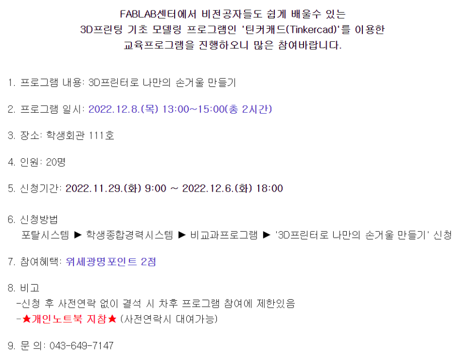 본문 시작 홈으로 학과생활 학과소개 교수소개 교과과정 학과생활 홈페이지가이드 사진게시판 공지사항 사진게시판 전공자료실 동아리 학과행사 사진게시판 페이스북 트위터 프린트 [FABLAB] 3D 프린터로 나만의 손거울 만들기 산업디자인학과 2851 2022-11-29 목록 이전[학술특강]성공하는 디자인 조건_Hitachi-LG DATA 디자인팀_우*호 팀장 다음 [FABLAB] 3D프린터를 활용한 지역-대학 협력형 평생교육 담당부서 : 산업디자인학과 담당자 : - 연락처 : 043-649-1436 최종수정일 : 2024-10-26 만족도조사 만족도 조사 이 페이지에서 제공하는 정보에 대하여 만족하시나요? 매우만족 만족 보통 불만족 매우불만족