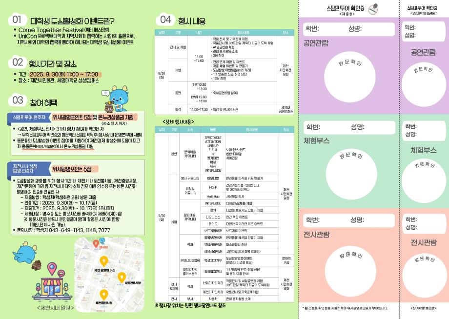 본문 시작 홈으로 학과생활 학과소개 교수소개 교과과정 학과생활 홈페이지가이드 사진게시판 공지사항 사진게시판 전공자료실 동아리 학과행사 사진게시판 페이스북 트위터 프린트 [학생처] 2025 대학생 도심활성화 이벤트[Come Together Festival(씨티페스티벌)] 개최 산업디자인학과 554 2025-09-24 학생처 목록 이전[기념품] 아트앤산업디자인학과 기념품 제작_에코백 다음 [세명대] 청룡체전 체험부스_산디과 동아리 활동 담당부서 : 산업디자인학과 담당자 : - 연락처 : 043-649-1436 최종수정일 : 2024-10-26 만족도조사 만족도 조사 이 페이지에서 제공하는 정보에 대하여 만족하시나요? 매우만족 만족 보통 불만족 매우불만족