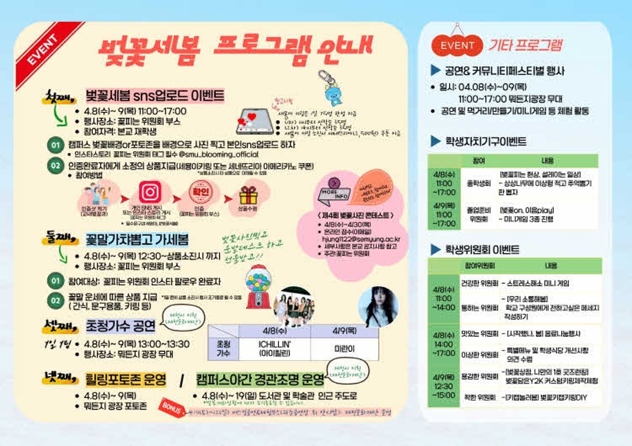 본문 시작 홈으로 학과생활 학과소개 교수소개 교과과정 학과생활 홈페이지가이드 사진게시판 공지사항 사진게시판 전공자료실 동아리 학과행사 사진게시판 페이스북 트위터 프린트 [벗꽃축제] 제 5회 세명대학교 벚꽃축제 '벚꽃세봄' 개최 아트앤산업디자인학과 16 2026-04-03 목록 이전[학생처] 우리 대학 '텃밭 가꾸기' 프로그램(분양) 안내 담당부서 : 산업디자인학과 담당자 : - 연락처 : 043-649-1436 최종수정일 : 2024-10-26 만족도조사 만족도 조사 이 페이지에서 제공하는 정보에 대하여 만족하시나요? 매우만족 만족 보통 불만족 매우불만족