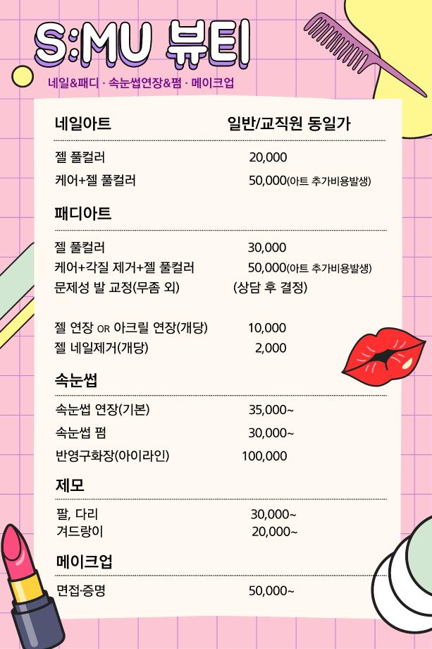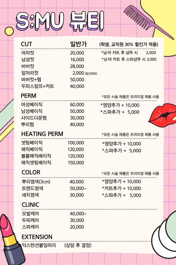 본문 시작 홈으로 커뮤니티 학과소개 교수소개 학과과정 커뮤니티 대학원 홈페이지가이드 포토갤러리 공지사항 채용정보 포토갤러리 Youtube 바로가기 Instargram 바로가기 Blog 바로가기 Facebook 바로가기 포토갤러리 페이스북 트위터 프린트 세명대학교 S:MU 뷰티 살롱 OPEN 뷰티케어학 2957 2023-09-01 1. 오픈일 : 2023년 9월 1일 2. 이용안내 : 전화 or 네이버 예약 3. 할인 : 세명대학교 교직원 인증 시 할인 된 가격으로 이용하실 수 있습니다 4. 위치 : 뷰티케어센터 2층 5. 관련문의 : 043-649-7368 목록 이전재학생 모교방문단: 정신여자고등학교 다음 2023년도 2학기 개강총회
