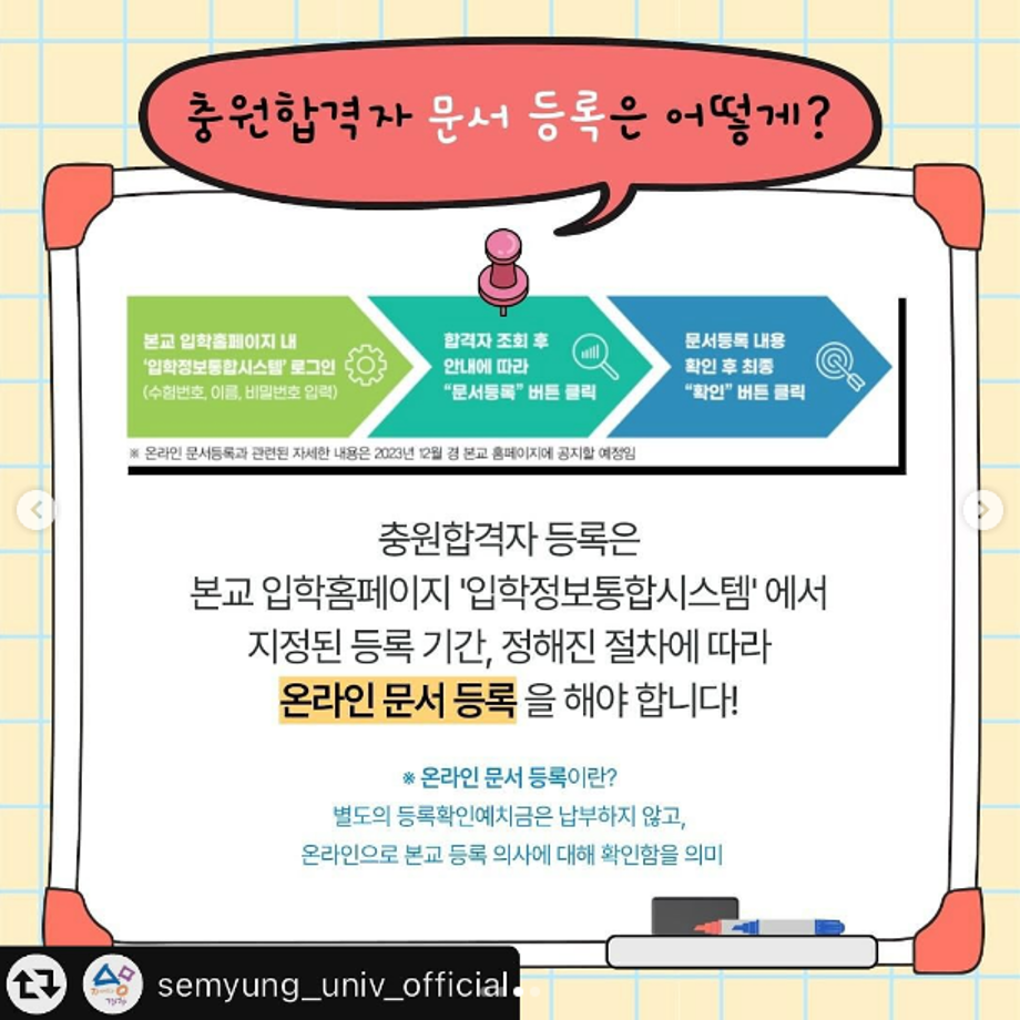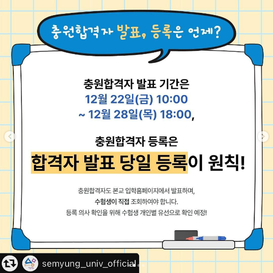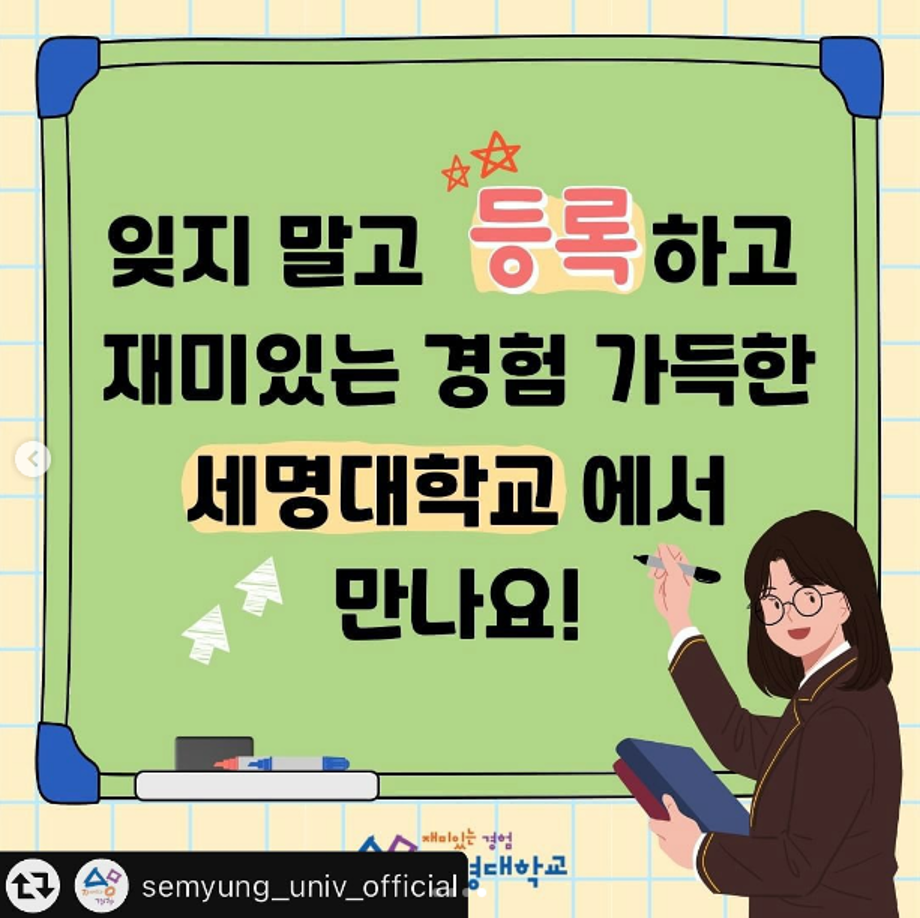 본문 시작 홈으로 커뮤니티 학과소개 교수소개 학과과정 커뮤니티 대학원 홈페이지가이드 포토갤러리 공지사항 채용정보 포토갤러리 Youtube 바로가기 Instargram 바로가기 Blog 바로가기 Facebook 바로가기 포토갤러리 페이스북 트위터 프린트 📢 2024학년도 세명대학교 수시모집 충원합격자 발표 및 등록 안내 뷰티케어학 2688 2023-12-22 2024학년도 수시모집 충원합격자 발표 및 등록 안내입니다👍 ✔12월 22일(금) 10:00부터 28일(금) 18:00✔까지 충원합격자 발표! 충원합격자 등록은 👉합격자 발표 당일 등록!!👈 잊지 말고 등록하고 ✨재미있는 경험 가득한 💙세명대학교💙에서 만나요! 목록 다음 더 가까워진 세명대학교! 다음 세명대학교도 지구를 위해 함께합니다!