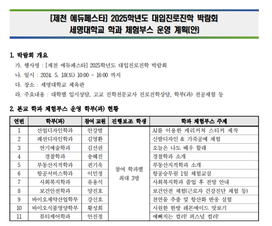 본문 시작 홈으로 커뮤니티 학과소개 교수소개 학과과정 커뮤니티 대학원 홈페이지가이드 포토갤러리 공지사항 채용정보 포토갤러리 Youtube 바로가기 Instargram 바로가기 Blog 바로가기 Facebook 바로가기 포토갤러리 페이스북 트위터 프린트 [제천 에듀페스타] 2025학년도 대입진로진학 박람회: 세명대학교 학과 체험부스 운영 뷰티케어학과 2074 2024-05-20 5월 18일 토요일, 세명대학교 체육관에서 2025학년도 대학 입시를 준비하고 있는 입시생들을 대상으로 한 진학 박람회가 열렸습니다. 우리 학과도 학과 체험부스를 운영하며 퍼스널 컬러 진단 프로그램을 진행했습니다:) 목록 이전㈜CCLIME(끌리메) 기업 설명회 다음 창업대체학점제 신청자를 모집