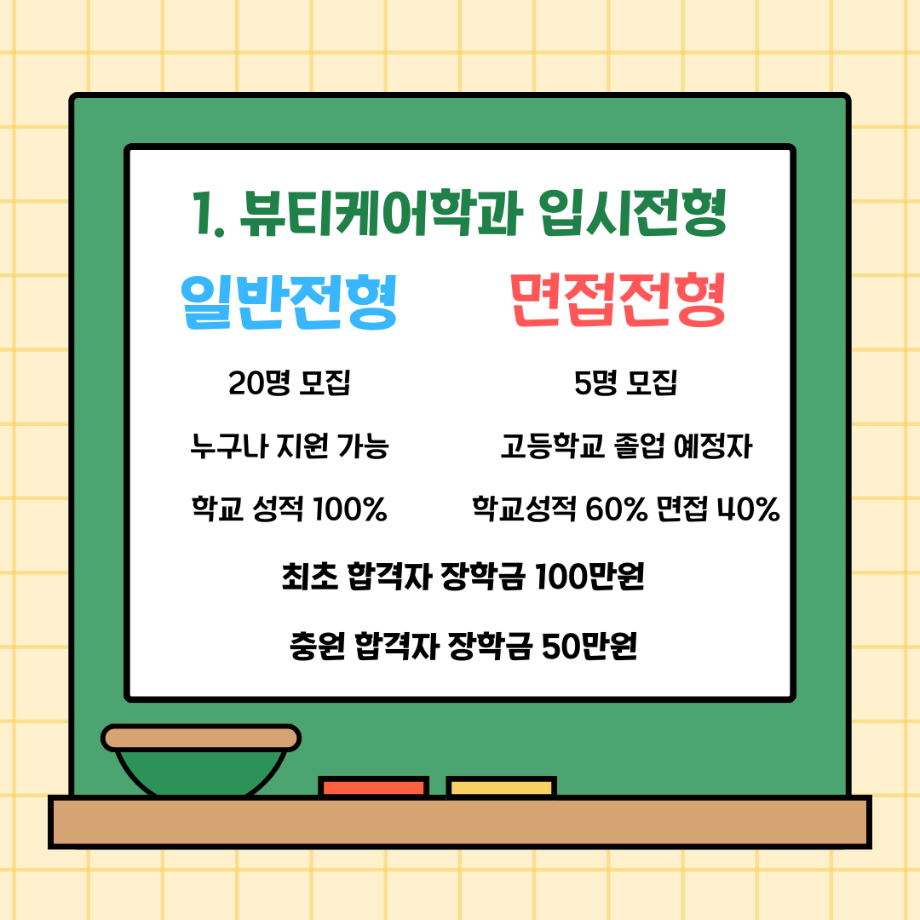 본문 시작 홈으로 커뮤니티 학과소개 교수소개 학과과정 커뮤니티 대학원 홈페이지가이드 포토갤러리 공지사항 채용정보 포토갤러리 Youtube 바로가기 Instargram 바로가기 Blog 바로가기 Facebook 바로가기 포토갤러리 페이스북 트위터 프린트 2025학년도 신입생 수시 입시 모집요강 뷰티케어학과 2122 2024-06-11 벌써 한 해의 절반 이상이 지나갔네요! 올해 입학한 24 학번 새내기 분들이 이제 새내기 티를 벗어내고 내년 2025년도에 있을 새로운 신입생 분들을 마주 할 시간도 별로 남지 않았어요:) 2025에 새로 들어올 예비 신입생 분들을 위해 세명대학교 뷰티케어학과의 수시 모집요강에 관하여 간략하게 알아보도록 할게요 목록 이전뷰티케어학과 2024년도 SMU연계프로그램 다음 뷰티케어학과 청주SBS뷰티아카데미 입시설명회