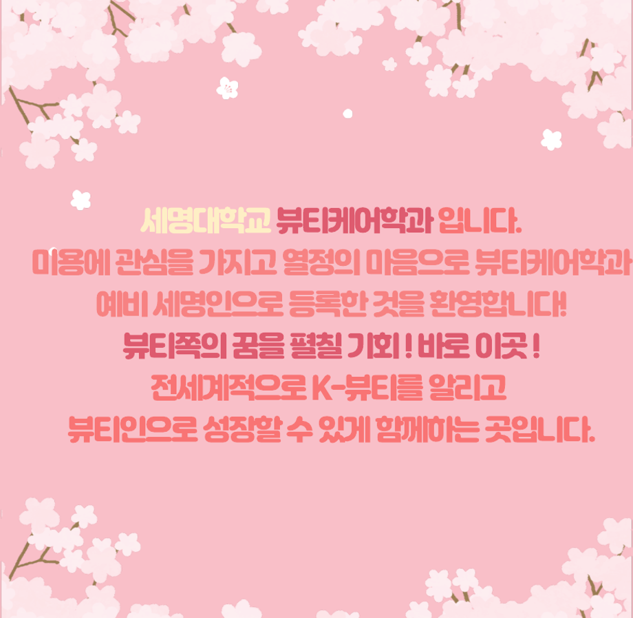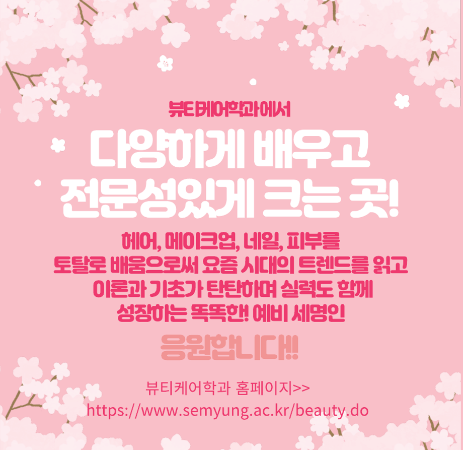 본문 시작 홈으로 커뮤니티 학과소개 교수소개 학과과정 커뮤니티 대학원 홈페이지가이드 포토갤러리 공지사항 채용정보 포토갤러리 Youtube 바로가기 Instargram 바로가기 Blog 바로가기 Facebook 바로가기 포토갤러리 페이스북 트위터 프린트 예비smu뷰티케어학과 학생들 반가워요!! 뷰티케어학과 1777 2024-09-10 우리 함꼐 멋진 미용인으로 성장합시다! 목록 이전09.09 ~ 09.13 세명대학교 수시모집 기긴입니다. 다음 043-649-1637 / 2025학년도 예비 신입생 여러분들께 수시 입시 무료 응시쿠폰(진학사,유웨이어플라이무료)을 드립니다.