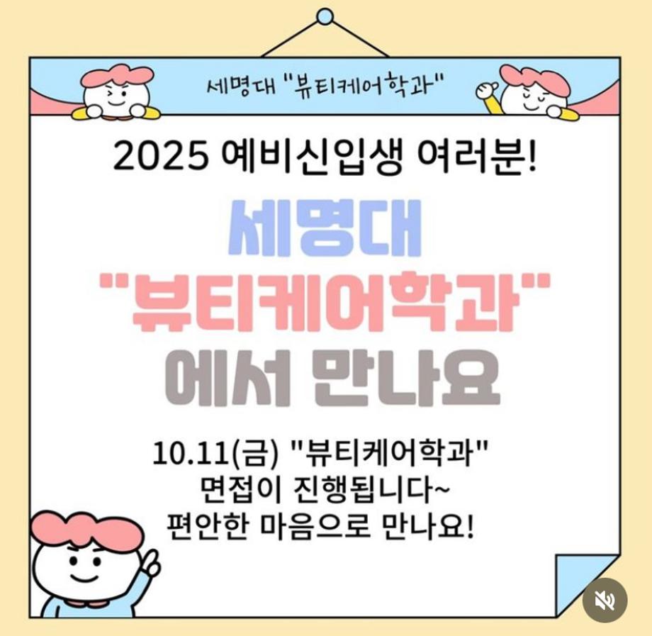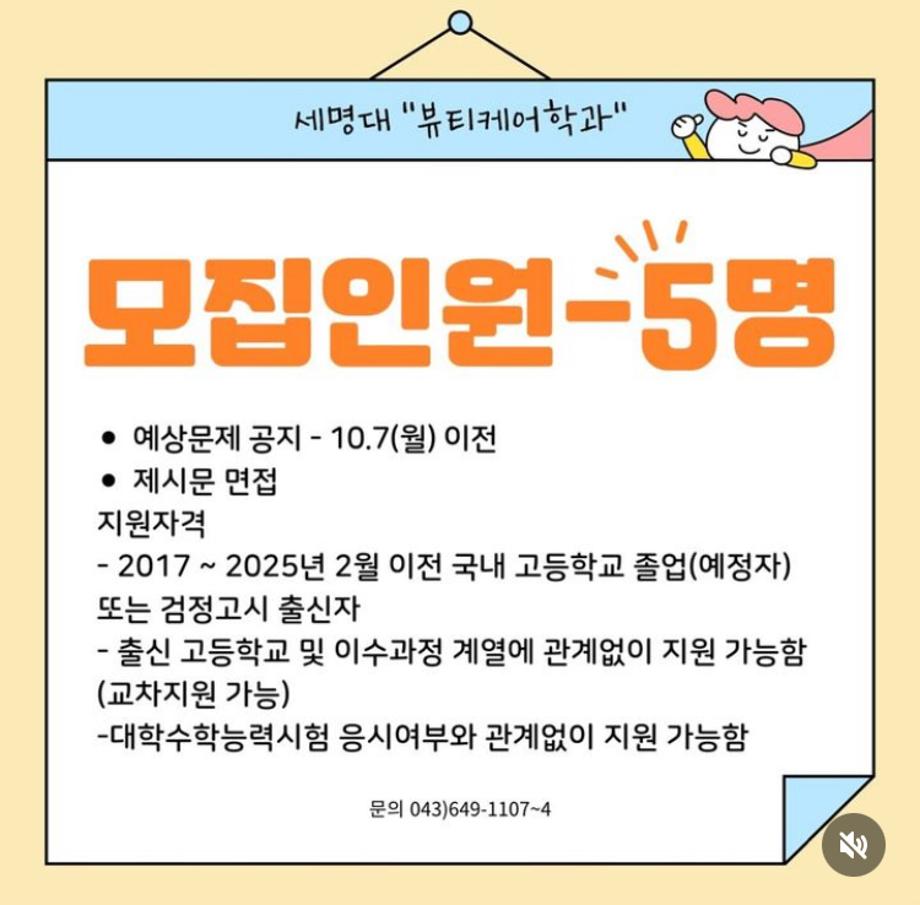 본문 시작 홈으로 커뮤니티 학과소개 교수소개 학과과정 커뮤니티 대학원 홈페이지가이드 포토갤러리 공지사항 채용정보 포토갤러리 Youtube 바로가기 Instargram 바로가기 Blog 바로가기 Facebook 바로가기 포토갤러리 페이스북 트위터 프린트 📣 2025 세명대학교 “뷰티케어학과” 면접우수자전형 면접 일정 📣 바이오코스메틱학과 1855 2024-10-02 📣 2025 세명대학교 “뷰티케어학과” 면접우수자전형 면접 일정 📣 면접우수자전형 면접은 10.11(금) 입니다!! 많은 관심과 지원 부탁드리겠습니다!! 2025 예비 세명인 여러분 “뷰티케어학과” 에서 만나요🫶🏻🫶🏻 목록 이전면접 우수자 전형 다음 헤어기초커트1