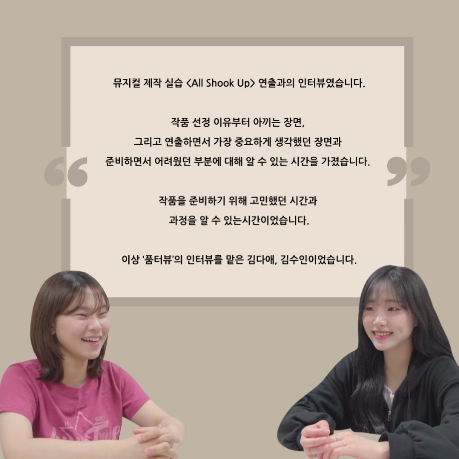 본문 시작 홈으로 커뮤니티 학과소개 입학정보 교수소개 학과과정 커뮤니티 공연예매 안내 홈페이지가이드 포토갤러리 공지사항 포토갤러리 작품DB 동아리 학사일정 학생회 포토갤러리 페이스북 트위터 프린트 ‘품’위있는 인‘터뷰’ - 24년도 뮤지컬제작실습 학생 연출 <임소정> 연기예술학과 3416 2025-01-09 . 목록 이전세명대학교 연기예술학과 정시모집 다음 ‘품’ 위 있는 인 ‘터뷰’ - 뮤지컬 제작실습 <올슉업> 채드 연세호 카드 뉴스 담당부서 : 연기예술학과 담당자 : - 연락처 : 043-649-1733 최종수정일 : 2024-10-26 만족도조사 만족도 조사 이 페이지에서 제공하는 정보에 대하여 만족하시나요? 매우만족 만족 보통 불만족 매우불만족
