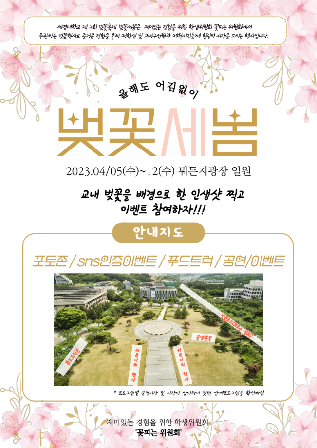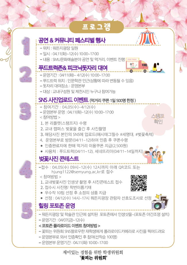 본문 시작 홈으로 커뮤니티 학과소개 입학정보 교수소개 학과과정 커뮤니티 공연예매 안내 홈페이지가이드 포토갤러리 공지사항 포토갤러리 작품DB 동아리 학사일정 학생회 포토갤러리 페이스북 트위터 프린트 제2회 세명대학교 벚꽃축제 개최 안내 연기예술학과 2696 2023-04-04 캠퍼스에 설레는 봄이 찾아왔습니다. 세명대학교 학생위원회인 '꽃피는 위원회'에서 준비한 제2회 세명대학교 벚꽃축제 개최 안내 목록 이전2023학년도 학생대상 폭력예방교육 다음 제8회 커뮤니티 페스티벌 담당부서 : 연기예술학과 담당자 : - 연락처 : 043-649-1733 최종수정일 : 2024-10-26 만족도조사 만족도 조사 이 페이지에서 제공하는 정보에 대하여 만족하시나요? 매우만족 만족 보통 불만족 매우불만족