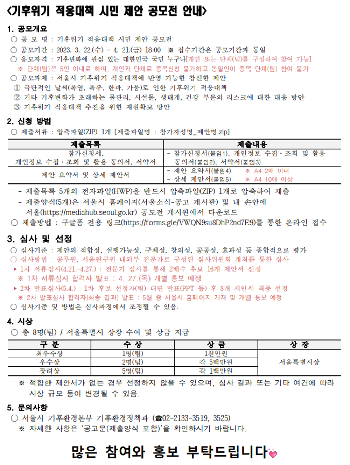 본문 시작 홈으로 커뮤니티 학과소개 입학정보 교수소개 학과과정 커뮤니티 공연예매 안내 홈페이지가이드 포토갤러리 공지사항 포토갤러리 작품DB 동아리 학사일정 학생회 포토갤러리 페이스북 트위터 프린트 「기후위기 적응대책 시민 제안 공모전」 안내 연기예술학과 2721 2023-04-13 「기후위기 적응대책 시민 제안 공모전」 안내 목록 이전2023학년도제8회 장애인식개선 UCC 공모전 시행 안내 다음 농촌신활력플러스사업 점프-업 액션그룹 양성 프로그램 도움닫기 과정 모집 담당부서 : 연기예술학과 담당자 : - 연락처 : 043-649-1733 최종수정일 : 2024-10-26 만족도조사 만족도 조사 이 페이지에서 제공하는 정보에 대하여 만족하시나요? 매우만족 만족 보통 불만족 매우불만족