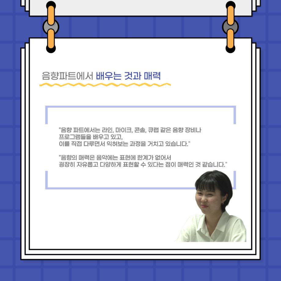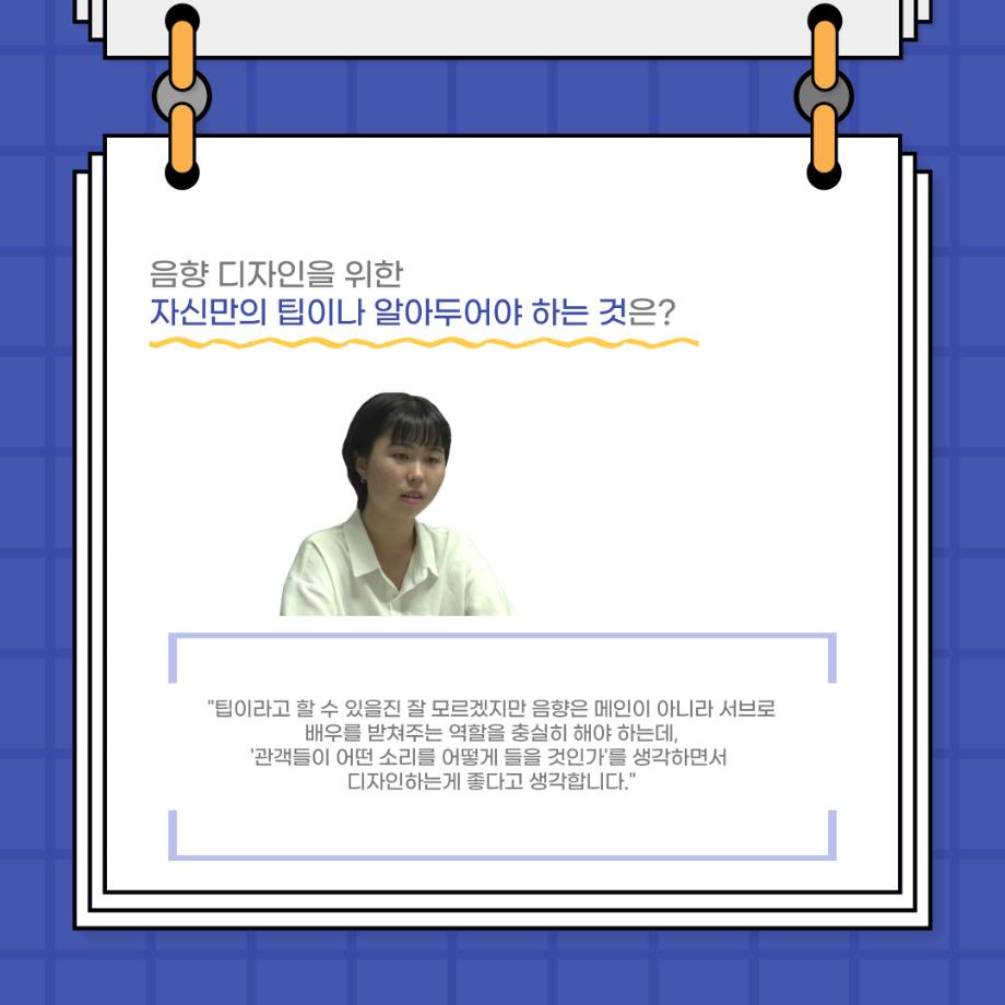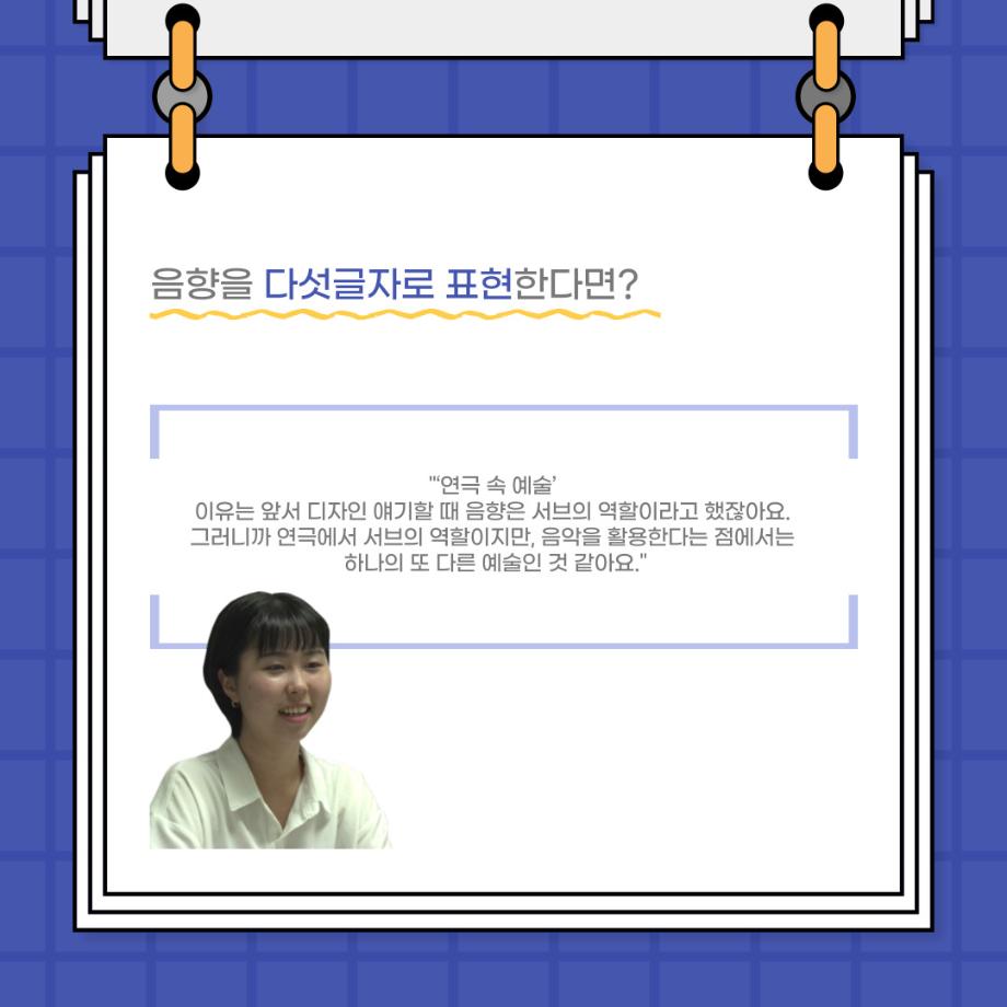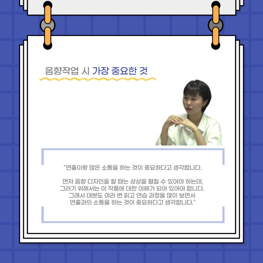 본문 시작 홈으로 커뮤니티 학과소개 입학정보 교수소개 학과과정 커뮤니티 공연예매 안내 홈페이지가이드 포토갤러리 공지사항 포토갤러리 작품DB 동아리 학사일정 학생회 포토갤러리 페이스북 트위터 프린트 사이와의 인터뷰 - 23년도 음향장 ‘최희진‘ 연기예술학과 3290 2023-07-24 안녕하십니까! 23년도 학회 ‘사이’입니다! 학회 ‘사이’의 다섯번째 인터뷰로 연기예술학과 23년도 음향장인 최희진 학생과 인터뷰하는 시간을 가졌습니다! 이번 인터뷰에서는 음향에 대한 매력과 음향 작업에서 가장 중요한 것, 음향 작업에서 알아두어야 하는 것 등에 대해 인터뷰하였습니 앞으로 있을 인터뷰 컨텐츠 ‘사인’도 많은 사랑 부탁드립니다. 목록 이전제 97회 세명대학교 연기예술학과 정기공연 하계 프로젝트 < 첼로와 케찹 > 다음 제 98회 세명대학교 연기예술학과 정기공연 하계 프로젝트 - < 하녀들 > 담당부서 : 연기예술학과 담당자 : - 연락처 : 043-649-1733 최종수정일 : 2024-10-26 만족도조사 만족도 조사 이 페이지에서 제공하는 정보에 대하여 만족하시나요? 매우만족 만족 보통 불만족 매우불만족