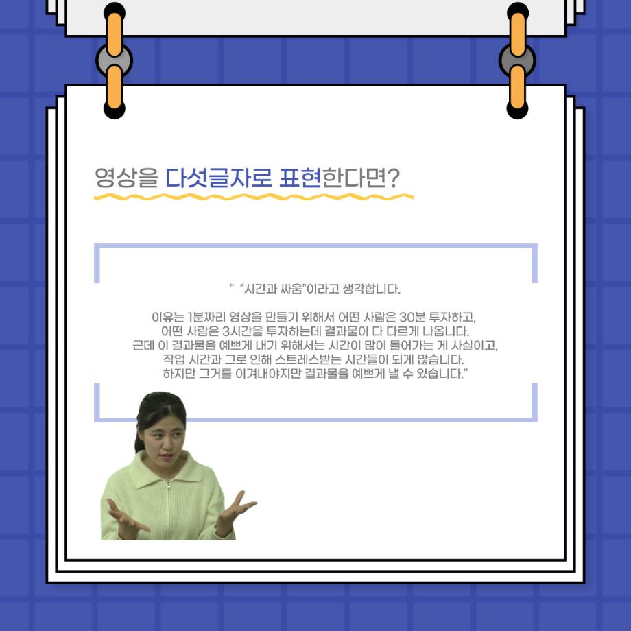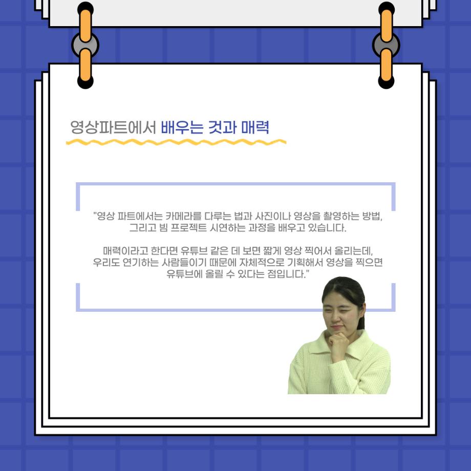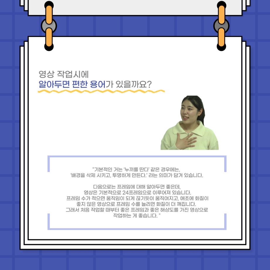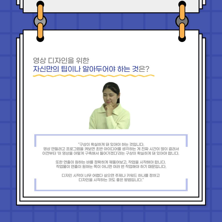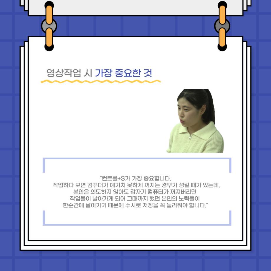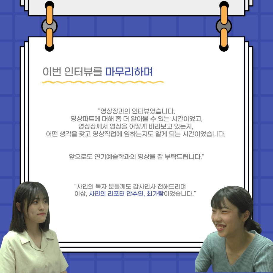 본문 시작 홈으로 커뮤니티 학과소개 입학정보 교수소개 학과과정 커뮤니티 공연예매 안내 홈페이지가이드 포토갤러리 공지사항 포토갤러리 작품DB 동아리 학사일정 학생회 포토갤러리 페이스북 트위터 프린트 사이와의 인터뷰 - 23년도 영상장 ‘양희진‘ 연기예술학과 3418 2023-10-13 안녕하십니까. 23년도 학회 ‘사이’입니다. 학회 ‘사이’의 아홉번째 인터뷰로 연기예술학과 23년도 1학기 영상장인 양희진 학생과 인터뷰하는 시간을 가졌습니다. 이번 인터뷰에서는 영상 파트의 매력과 영상 작업시 가장 중요한 것, 영상 작업에서 알아두어야 하는 것 등에 대해 인터뷰하였습니다. 다음 인터뷰 컨텐츠 ‘사인’도 많은 사랑 부탁드립니다. 목록 이전2학기 맞이 학과 대청소 다음 사이와의 인터뷰 - 23년도 영상사수 ‘안지민‘ 담당부서 : 연기예술학과 담당자 : - 연락처 : 043-649-1733 최종수정일 : 2024-10-26 만족도조사 만족도 조사 이 페이지에서 제공하는 정보에 대하여 만족하시나요? 매우만족 만족 보통 불만족 매우불만족