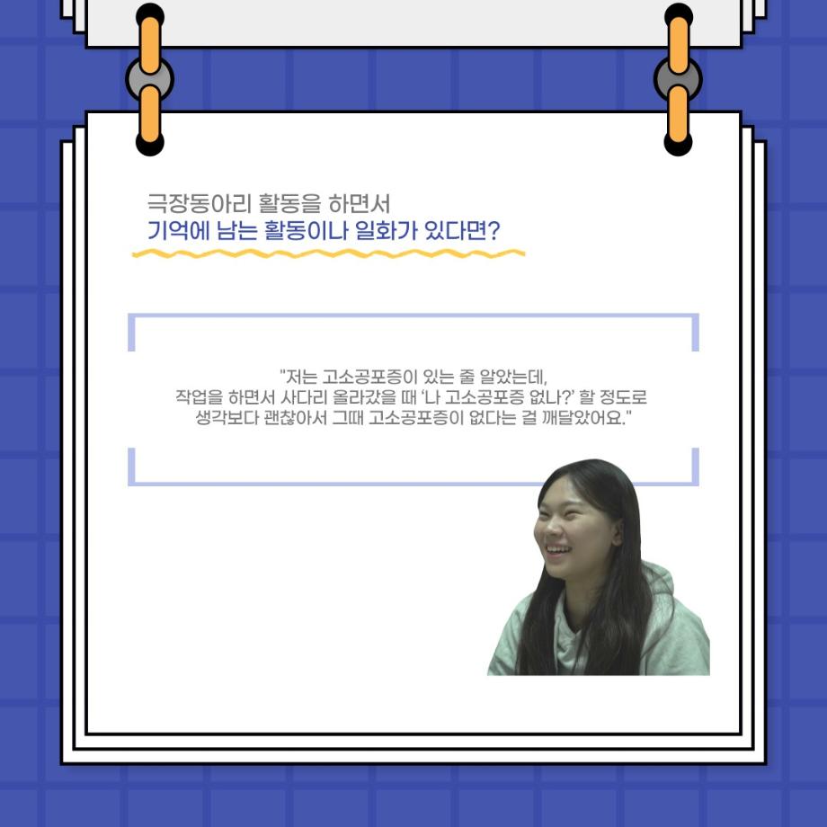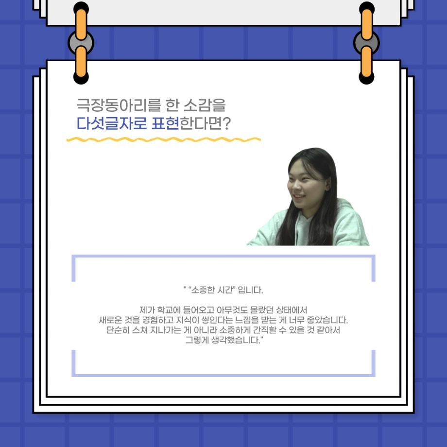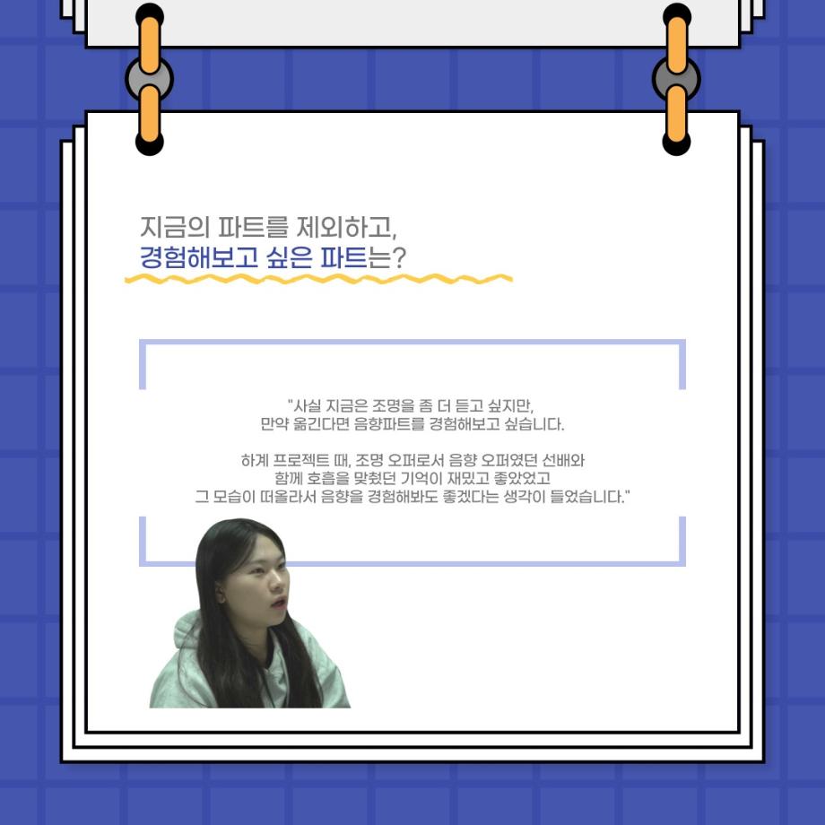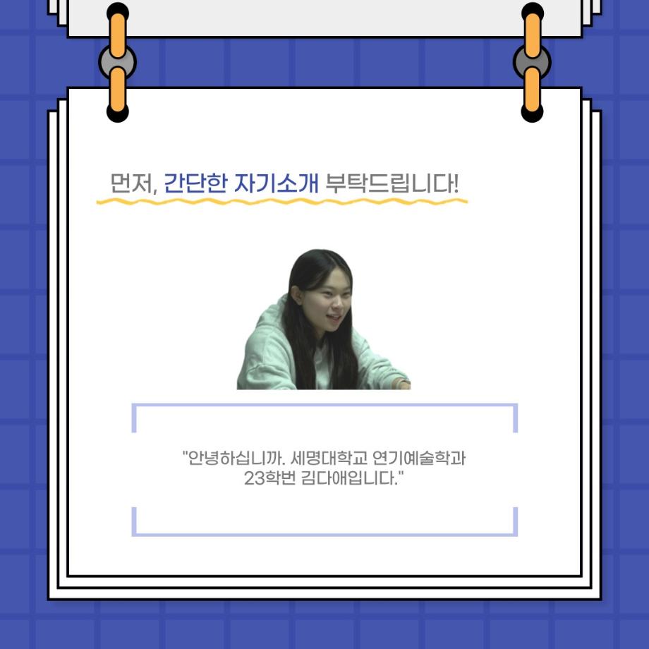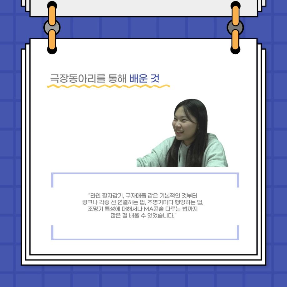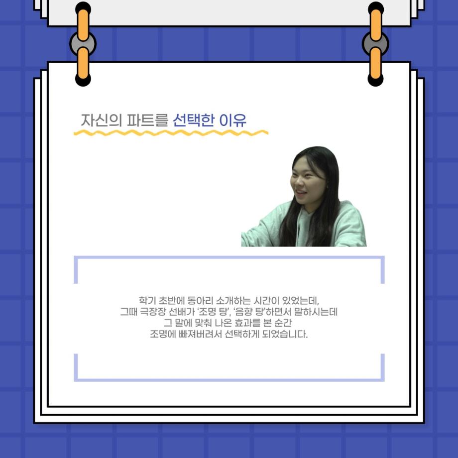 본문 시작 홈으로 커뮤니티 학과소개 입학정보 교수소개 학과과정 커뮤니티 공연예매 안내 홈페이지가이드 포토갤러리 공지사항 포토갤러리 작품DB 동아리 학사일정 학생회 포토갤러리 페이스북 트위터 프린트 사이와의 인터뷰 - 23년도 극장동아리 조명 파트 부원 ‘김다애' 연기예술학과 3799 2023-11-24 사이와의 인터뷰 - 23년도 극장동아리 조명 파트 부원 ‘김다애' 안녕하십니까. 23년도 학회 ‘사이’입니다. 학회 ‘사이’의 열두번째 인터뷰로 연기예술학과 23년도 극장동아리 조명 파트 부원인 김다애 학생과 인터뷰하는 시간을 가졌습니다. 이번 인터뷰에서는 조명파트를 선택한 이유, 극장동아리를 통해 배운 것, 동아리를 하면서 기억에 남는 활동이나 일화 등에 대해 인터뷰하였습니다. 목록 이전제100회 세명대학교 연기예술학과 정기공연 2학년 <중급연기 관찰발표회> 스틸컷 다음 교내 개인형 이동장치전동킥보드 등 이용 안전수칙 안내 담당부서 : 연기예술학과 담당자 : - 연락처 : 043-649-1733 최종수정일 : 2024-10-26 만족도조사 만족도 조사 이 페이지에서 제공하는 정보에 대하여 만족하시나요? 매우만족 만족 보통 불만족 매우불만족