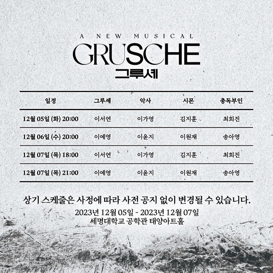 본문 시작 홈으로 커뮤니티 학과소개 입학정보 교수소개 학과과정 커뮤니티 공연예매 안내 홈페이지가이드 포토갤러리 공지사항 포토갤러리 작품DB 동아리 학사일정 학생회 포토갤러리 페이스북 트위터 프린트 제 101회 세명대학교 연기예술학과 뮤지컬제작실습 <Grusche> 포스터 & 예매링크 & 캐스트 연기예술학과 2895 2023-11-30 선으로 향한 유혹은 얼마나 끔찍한가 𝐀 𝐍𝐄𝐖 𝐌𝐔𝐒𝐈𝐂𝐀𝐋 <𝐆𝐫𝐮𝐬𝐜𝐡𝐞> - 인스타그램 @musical_grusche www.instagram.com/musical_grusche - 세명대학교 연기예술학과 뮤지컬제작실습 뮤지컬 <그루셰> 2023. 12. 05 20:00 2023. 12. 06 20:00 2023. 12. 07 18:00 / 21:00 세명대학교 공학관 태양아트홀 목록 이전[재학생필독]2024학년도 1학기 국가장학금 및 국가근로장학금 1차 신청 안내 다음 제100회 세명대학교 연기예술학과 정기공연 2학년 <중급연기 관찰발표회> 포스터 담당부서 : 연기예술학과 담당자 : - 연락처 : 043-649-1733 최종수정일 : 2024-10-26 만족도조사 만족도 조사 이 페이지에서 제공하는 정보에 대하여 만족하시나요? 매우만족 만족 보통 불만족 매우불만족
