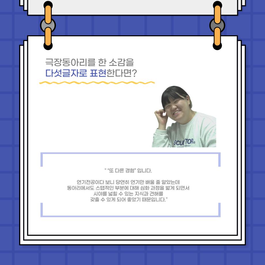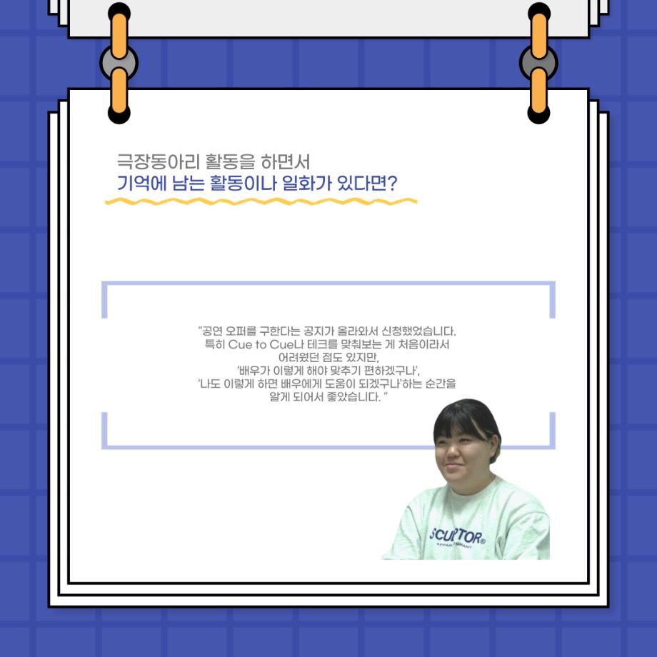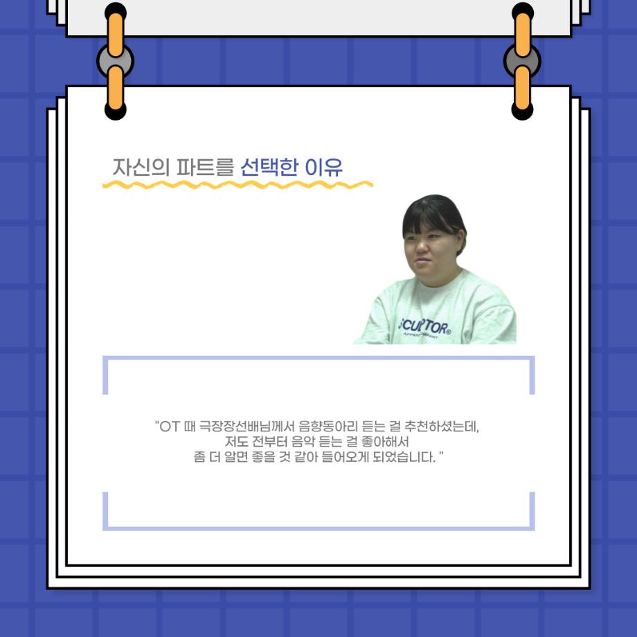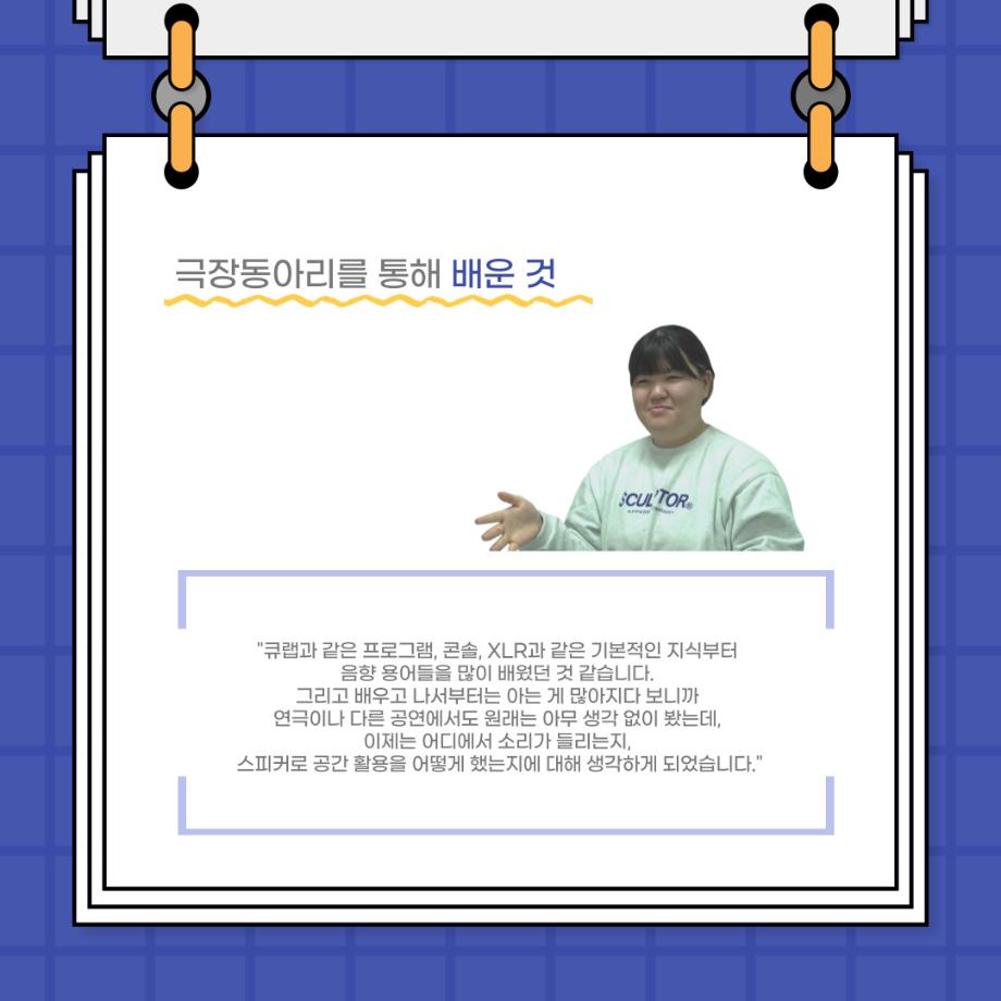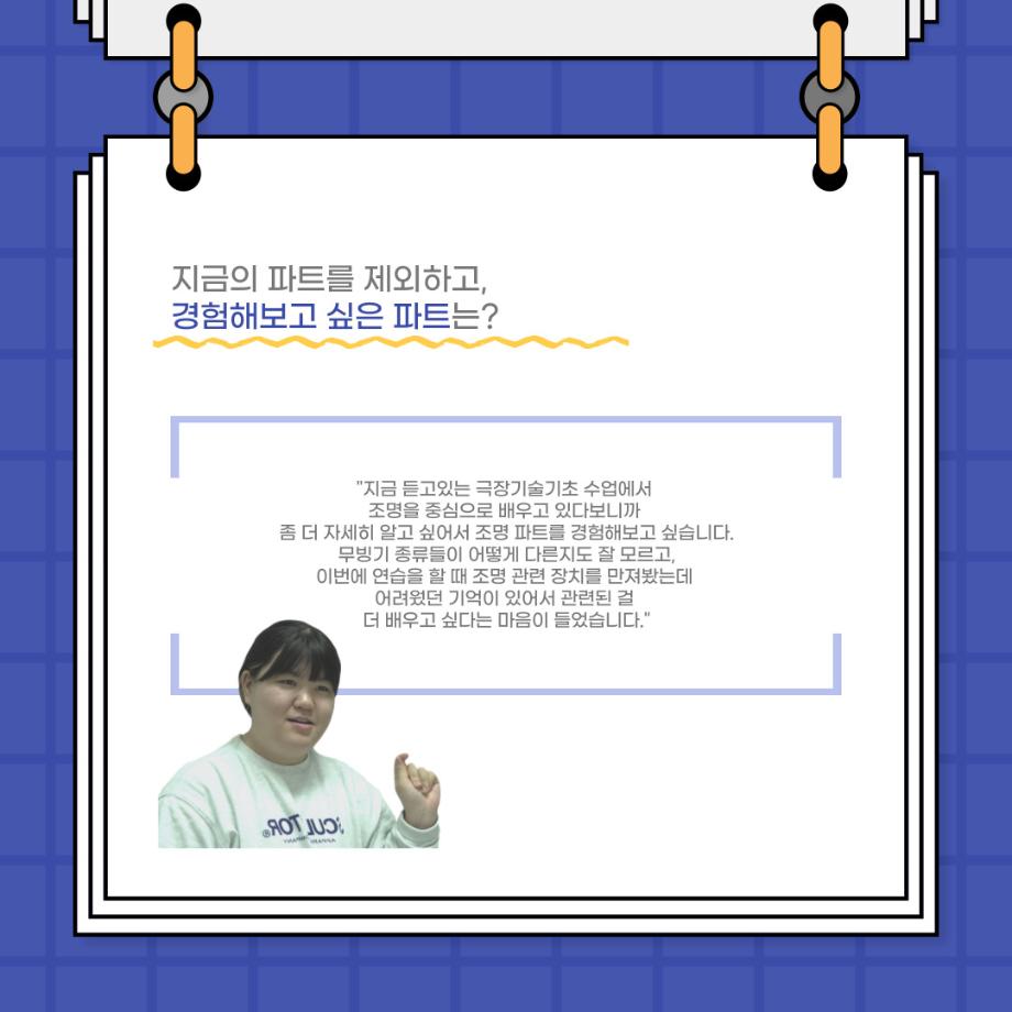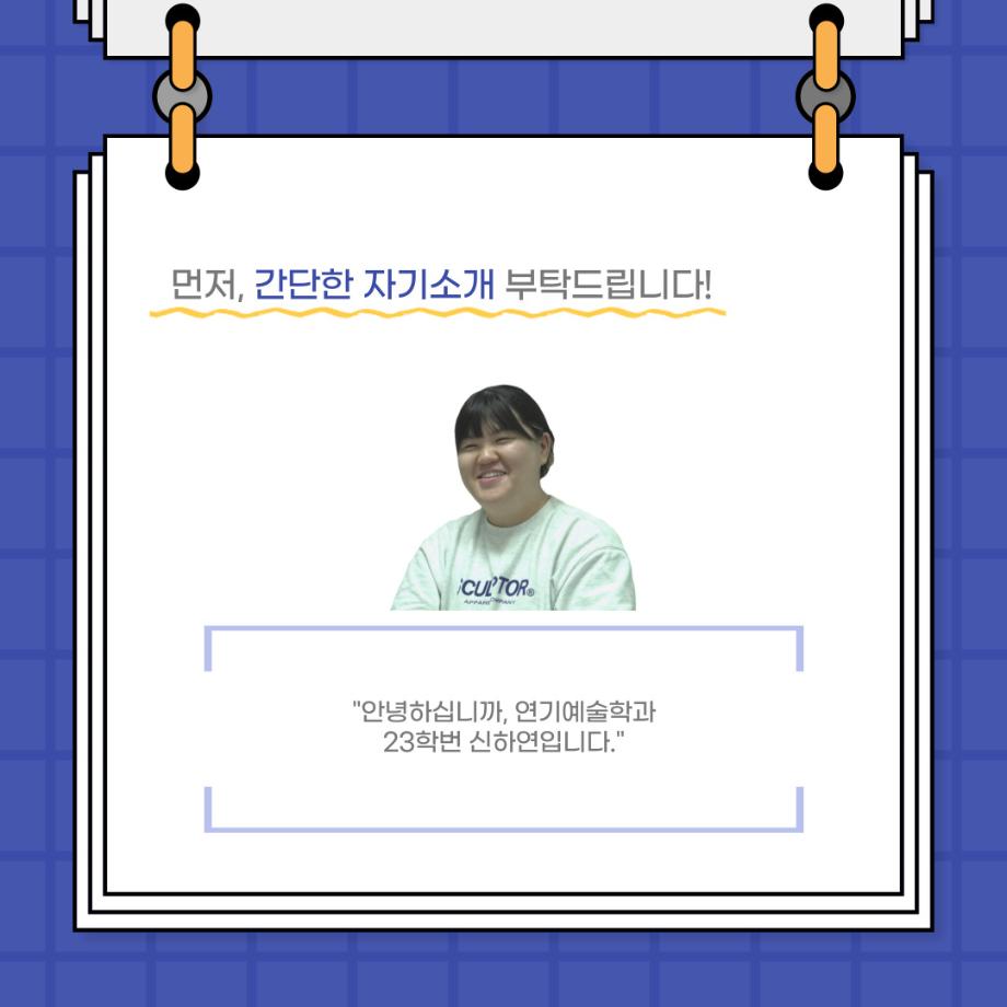 본문 시작 홈으로 커뮤니티 학과소개 입학정보 교수소개 학과과정 커뮤니티 공연예매 안내 홈페이지가이드 포토갤러리 공지사항 포토갤러리 작품DB 동아리 학사일정 학생회 포토갤러리 페이스북 트위터 프린트 사이와의 인터뷰 - 23년도 극장동아리 음향 파트 부원 ‘신하연' 연기예술학과 3156 2024-01-12 안녕하십니까. 23년도 학회 ‘사이’입니다. 학회 ‘사이’의 열네번째 인터뷰로 연기예술학과 23년도 극장동아리 음향 파트 부원인 신하연 학생과 인터뷰하는 시간을 가졌습니다. 이번 인터뷰에서는 음향파트를 선택한 이유, 극장동아리를 통해 배운 것, 동아리를 하면서 기억에 남는 활동이나 일화 등에 대해 인터뷰하였습니다. 다음 인터뷰 컨텐츠 ‘사인’도 많은 사랑 부탁드립니다. 목록 이전미래 인재를 위한 한방정밀의료 기초 교육 및 치료 체험 참가자 모집 다음 제102회 세명대학교 연기예술학과 정기공연 1학년 <에쮸드 발표회> 스틸컷 담당부서 : 연기예술학과 담당자 : - 연락처 : 043-649-1733 최종수정일 : 2024-10-26 만족도조사 만족도 조사 이 페이지에서 제공하는 정보에 대하여 만족하시나요? 매우만족 만족 보통 불만족 매우불만족