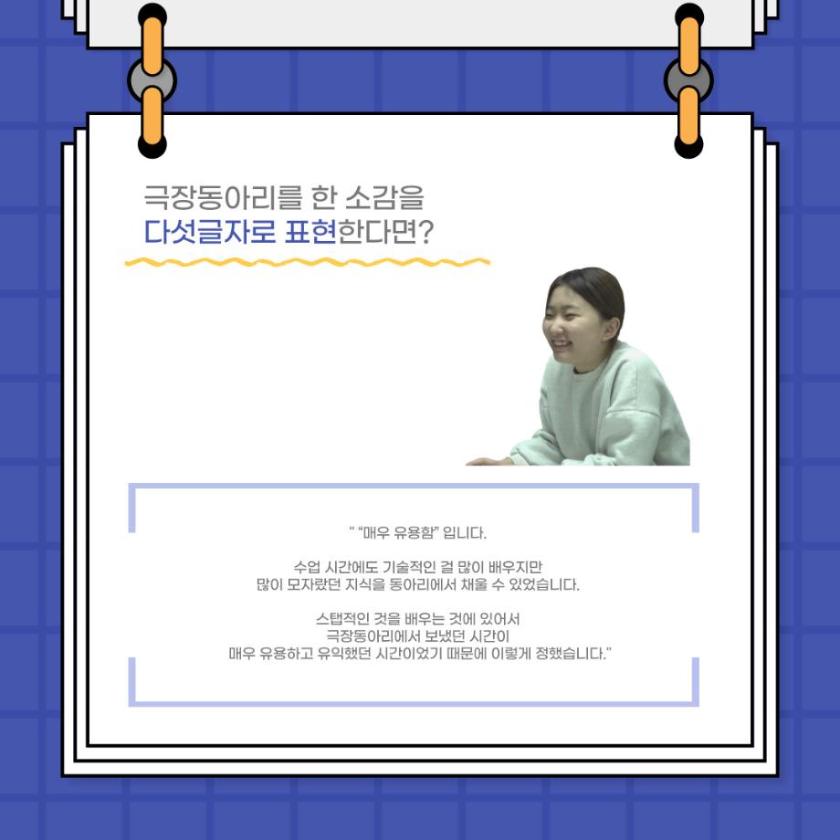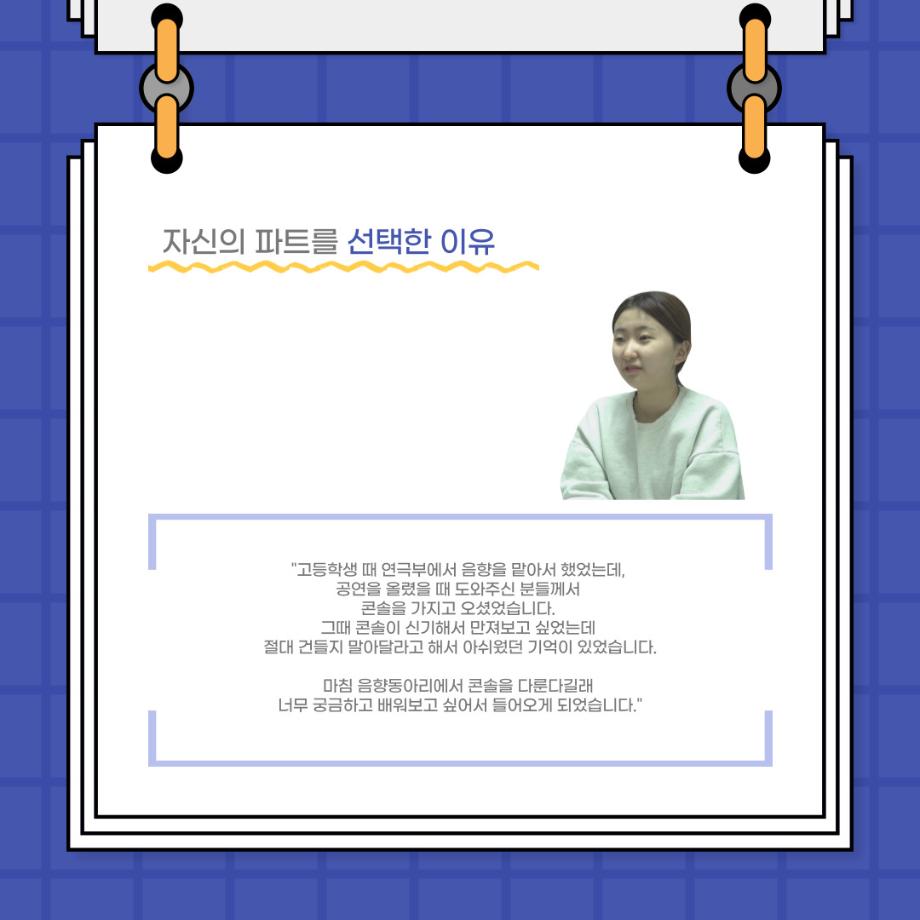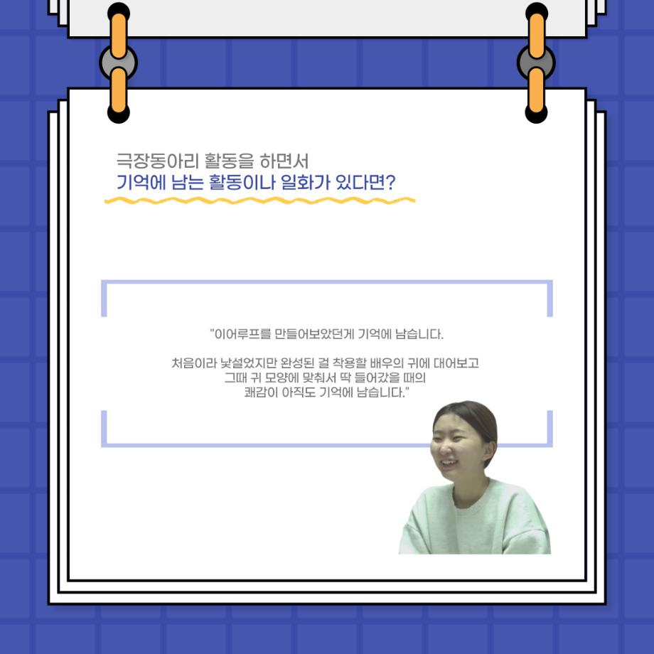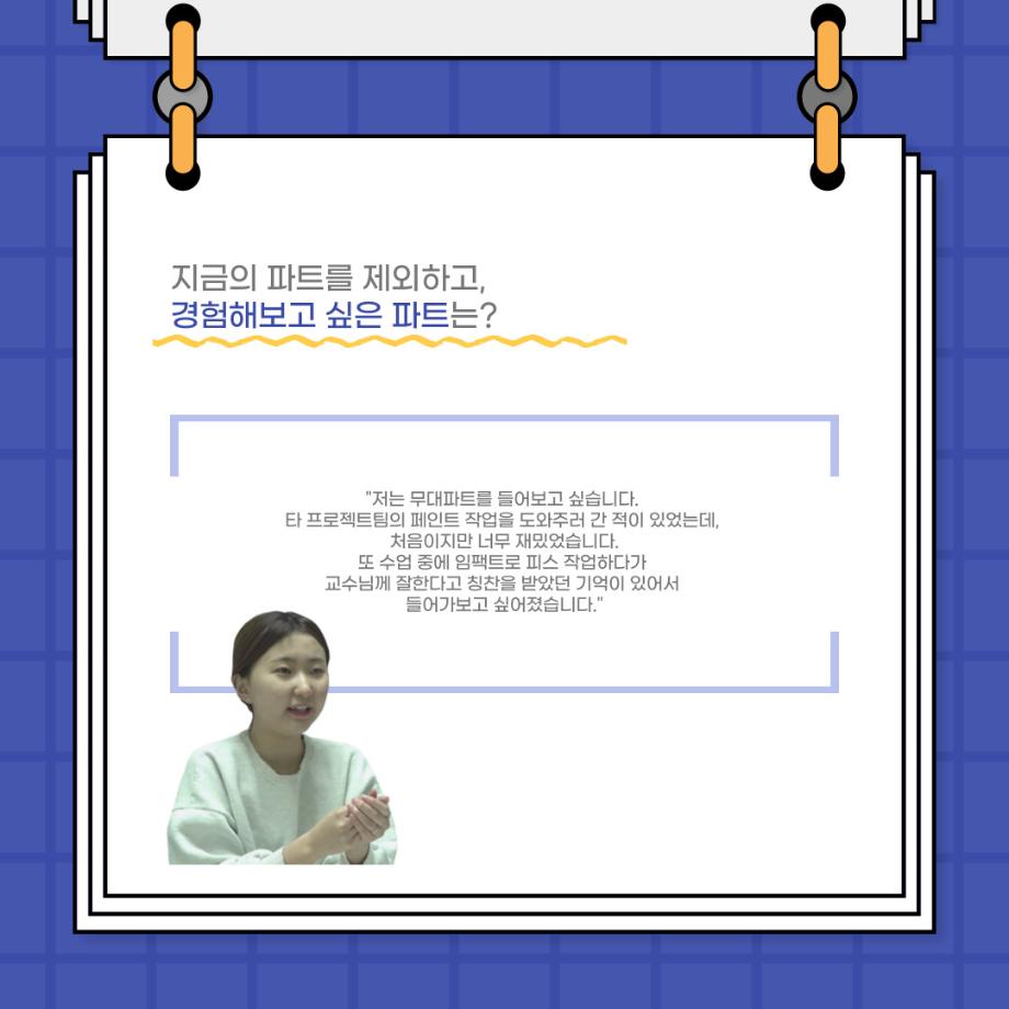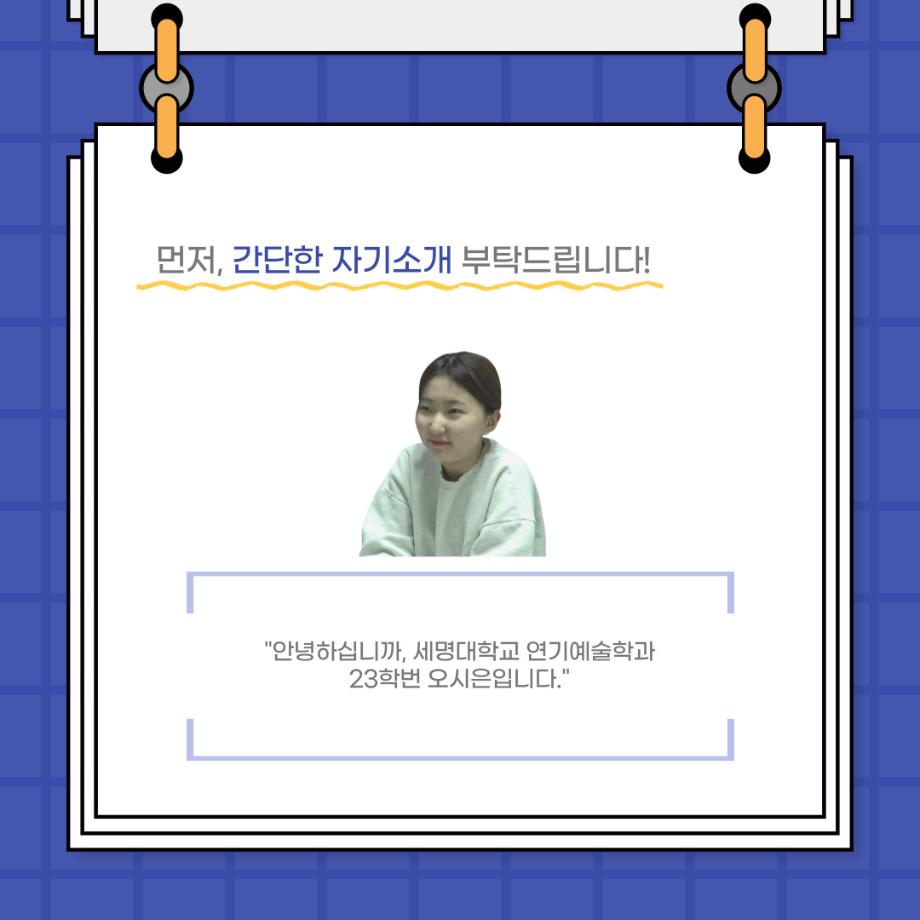 본문 시작 홈으로 커뮤니티 학과소개 입학정보 교수소개 학과과정 커뮤니티 공연예매 안내 홈페이지가이드 포토갤러리 공지사항 포토갤러리 작품DB 동아리 학사일정 학생회 포토갤러리 페이스북 트위터 프린트 사이와의 인터뷰 - 23년도 극장동아리 음향 파트 부원 ‘오시은‘ 연기예술학과 2805 2024-01-19 안녕하십니까. 23년도 학회 ‘사이’입니다. 학회 ‘사이’의 열다섯번째 인터뷰로 연기예술학과 23년도 극장동아리 음향 파트 부원인 오시은 학생과 인터뷰하는 시간을 가졌습니다. 이번 인터뷰에서는 음향파트를 선택한 이유, 극장동아리를 통해 배운 것, 동아리를 하면서 기억에 남는 활동이나 일화 등에 대해 인터뷰하였습니다. 다음 인터뷰 컨텐츠 ‘사인’도 많은 사랑 부탁드립니다. 목록 이전제102회 세명대학교 연기예술학과 정기공연 1학년 <에쮸드 발표회> 공연 성료 다음 찾아가는 충북 도립극단 설명회 담당부서 : 연기예술학과 담당자 : - 연락처 : 043-649-1733 최종수정일 : 2024-10-26 만족도조사 만족도 조사 이 페이지에서 제공하는 정보에 대하여 만족하시나요? 매우만족 만족 보통 불만족 매우불만족