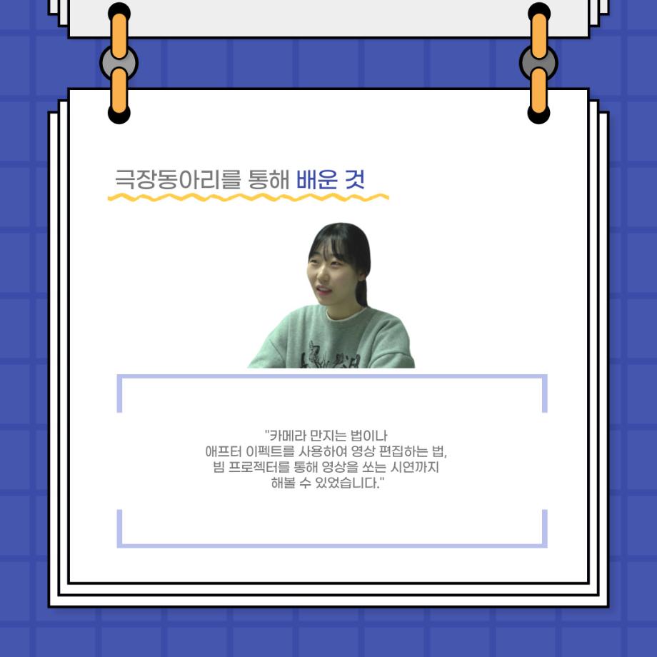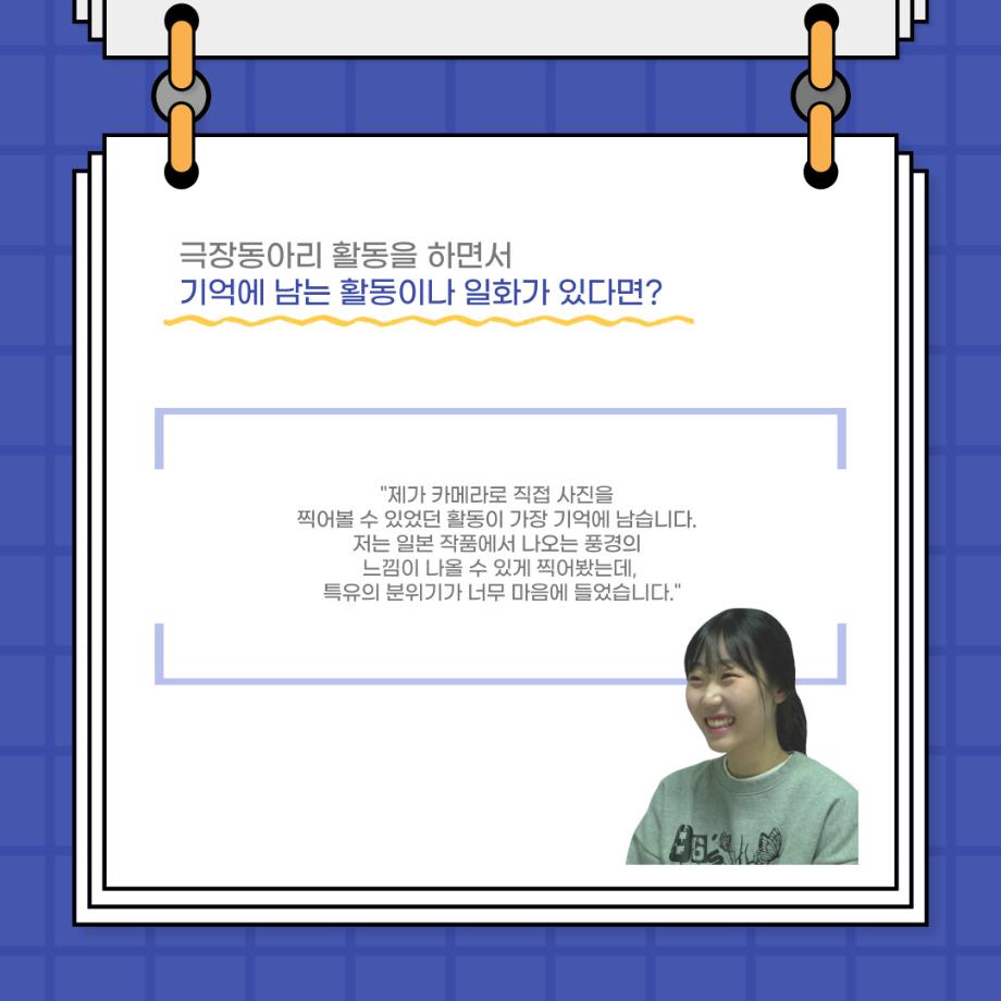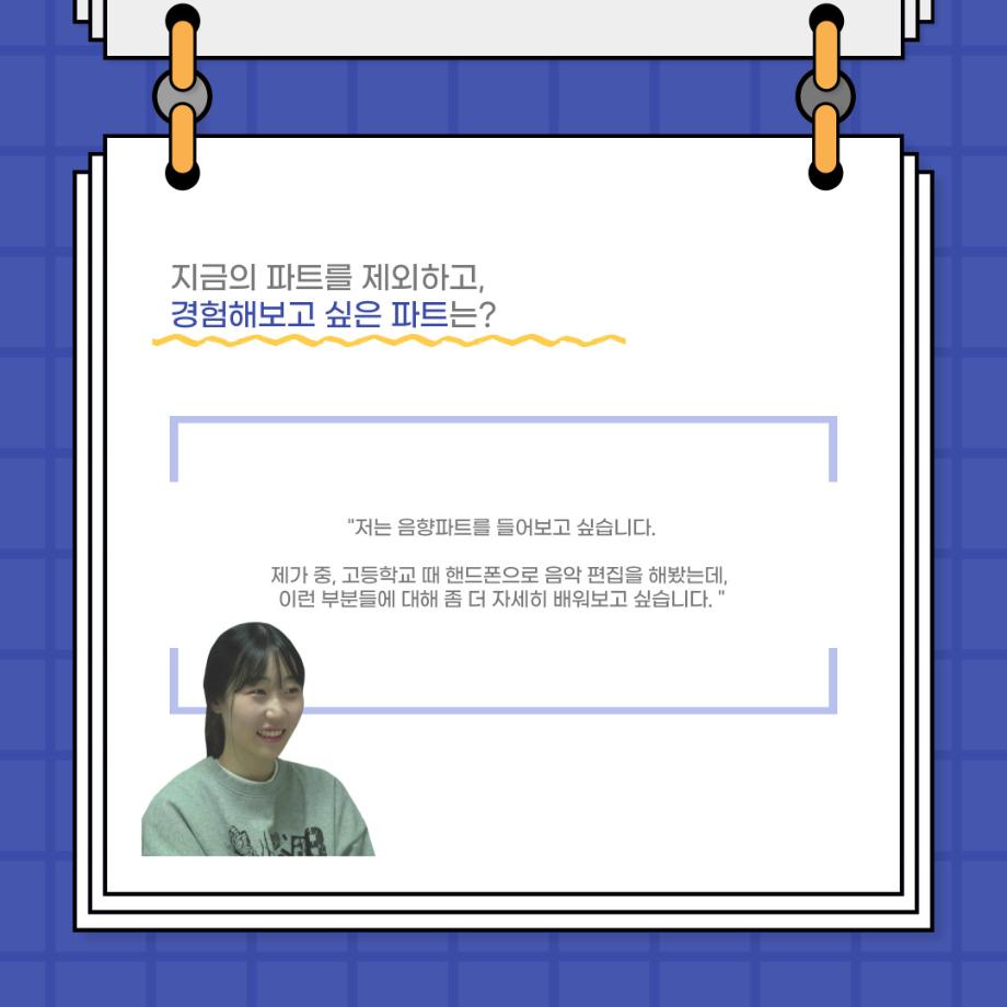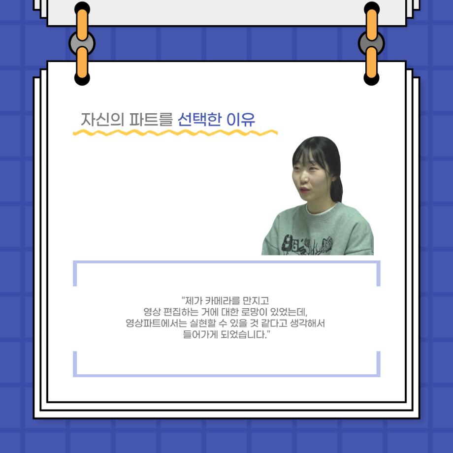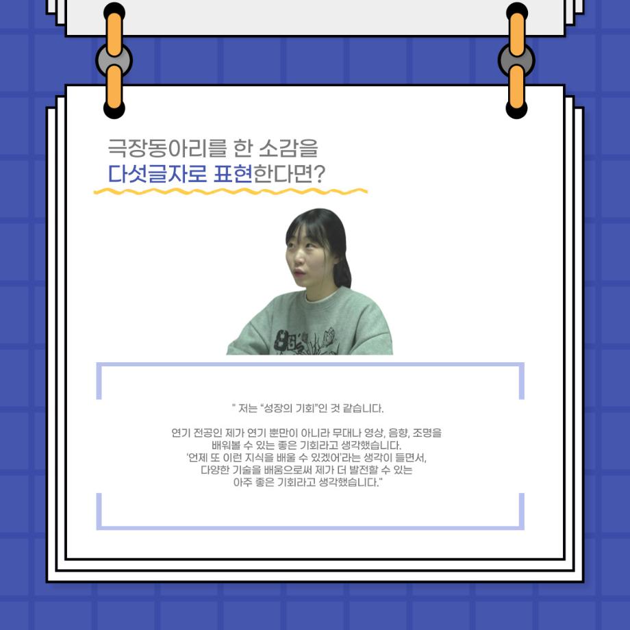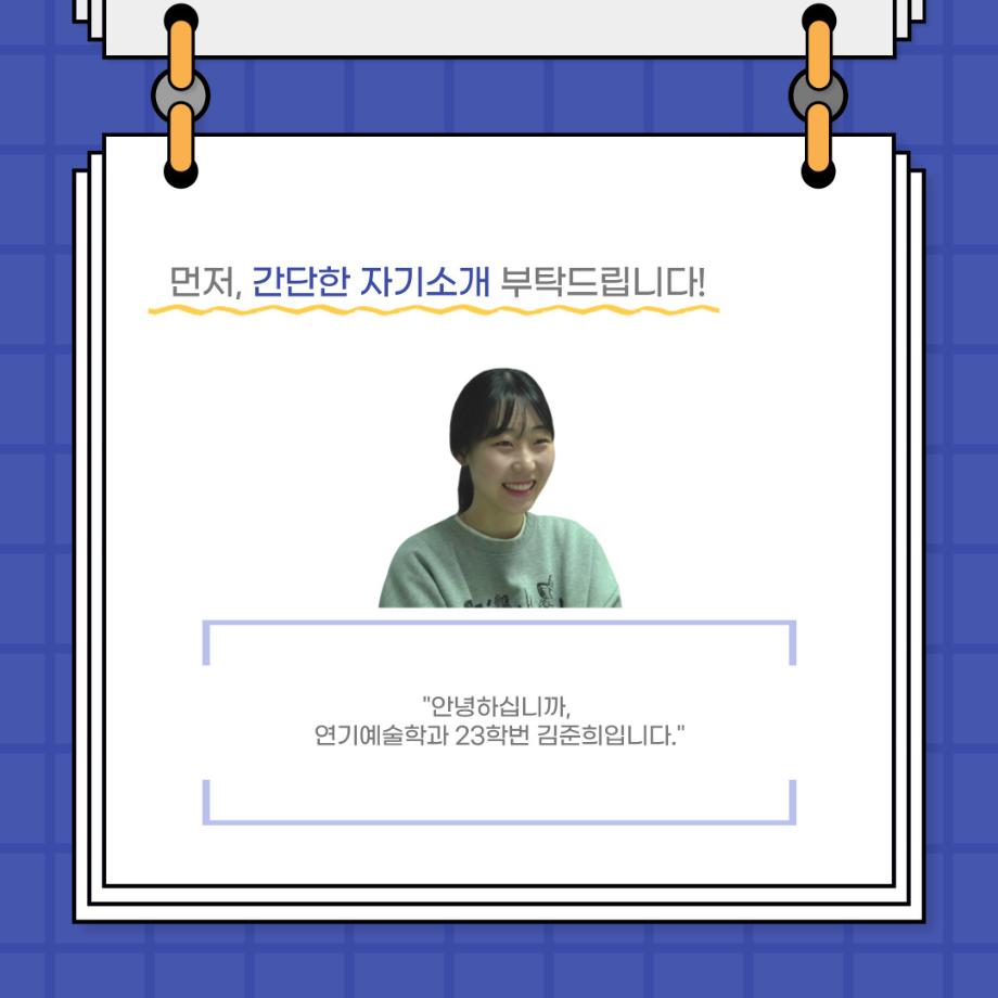 본문 시작 홈으로 커뮤니티 학과소개 입학정보 교수소개 학과과정 커뮤니티 공연예매 안내 홈페이지가이드 포토갤러리 공지사항 포토갤러리 작품DB 동아리 학사일정 학생회 포토갤러리 페이스북 트위터 프린트 사이와의 인터뷰 - 23년도 극장동아리 영상 파트 부원 ‘김준희‘ 연기예술학과 2627 2024-01-26 안녕하십니까. 23년도 학회 ‘사이’입니다. 학회 ‘사이’의 열여덟번째 인터뷰로 연기예술학과 23년도 극장동아리 영상 파트 부원인 김준희 학생과 인터뷰하는 시간을 가졌습니다. 이번 인터뷰에서는 영상파트를 선택한 이유, 극장동아리를 통해 배운 것, 동아리를 하면서 기억에 남는 활동이나 일화 등에 대해 인터뷰하였습니다. 다음 인터뷰 컨텐츠 ‘사인’도 많은 사랑 부탁드립니다. 목록 이전사이와의 인터뷰 - 23년도 극장동아리 무대 파트 부원 ‘박상훈‘ 다음 세명대학교 연기예술학과 특강 [박건형 배우님] 담당부서 : 연기예술학과 담당자 : - 연락처 : 043-649-1733 최종수정일 : 2024-10-26 만족도조사 만족도 조사 이 페이지에서 제공하는 정보에 대하여 만족하시나요? 매우만족 만족 보통 불만족 매우불만족