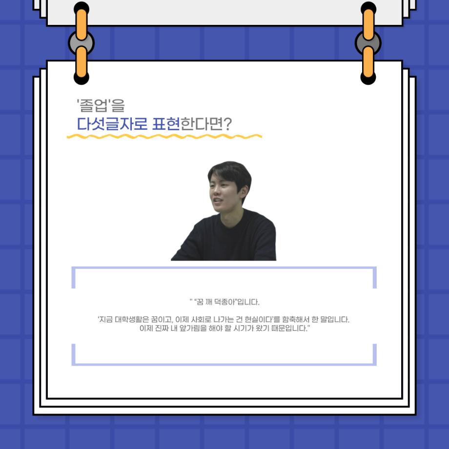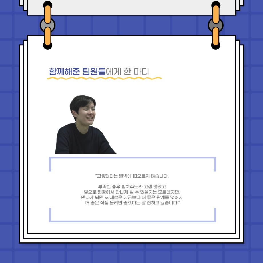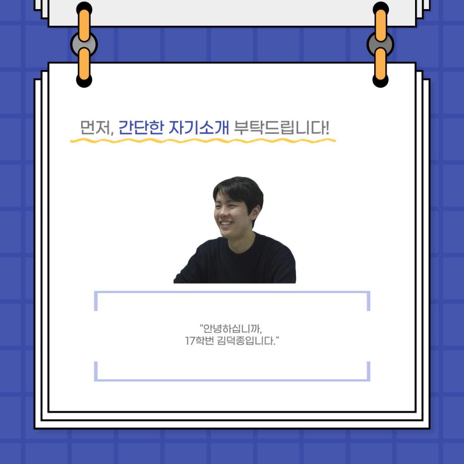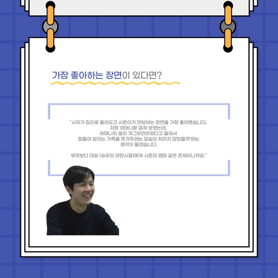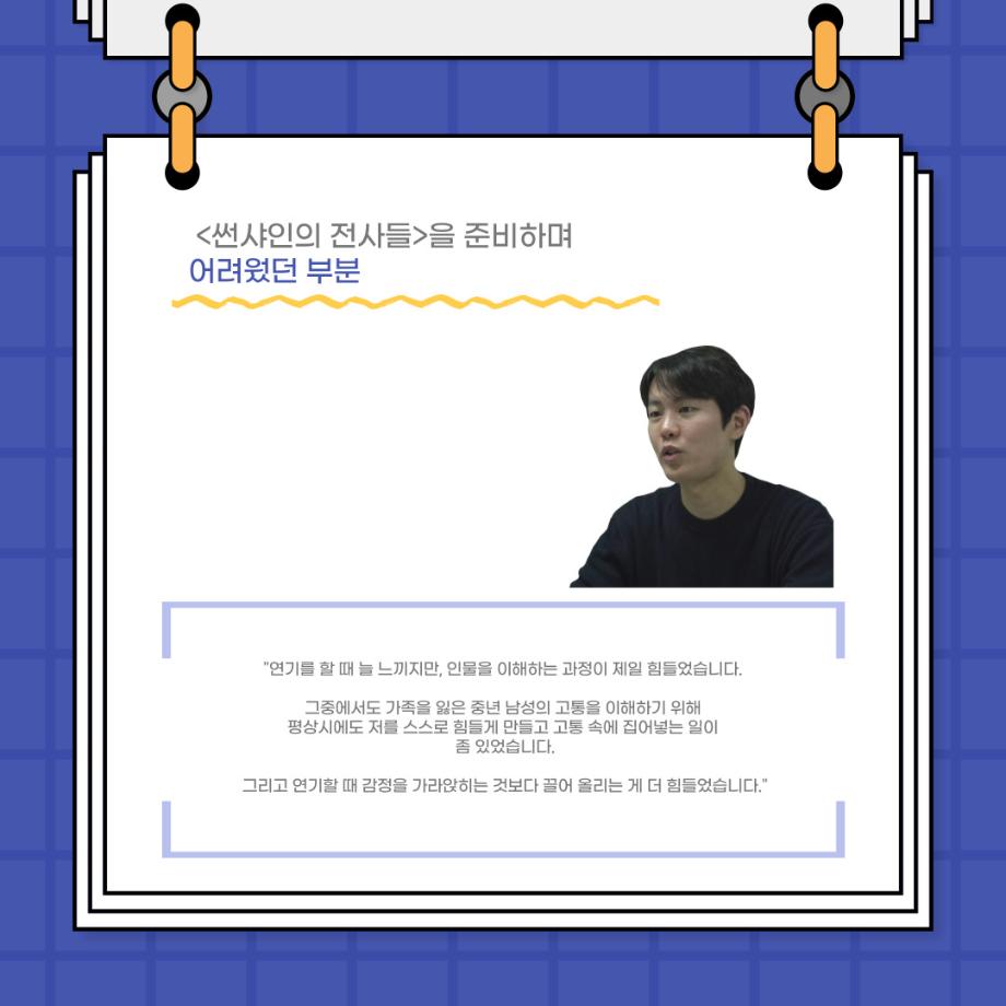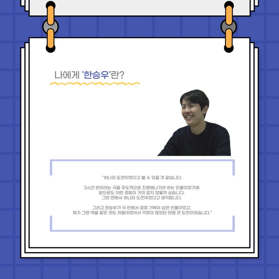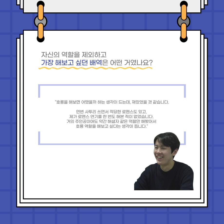 본문 시작 홈으로 커뮤니티 학과소개 입학정보 교수소개 학과과정 커뮤니티 공연예매 안내 홈페이지가이드 포토갤러리 공지사항 포토갤러리 작품DB 동아리 학사일정 학생회 포토갤러리 페이스북 트위터 프린트 사이와의 인터뷰 - 23년도 졸업작품 한승우役 ‘김덕종‘ 연기예술학과 3078 2024-02-06 안녕하십니까. 23년도 학회 ‘사이’입니다. 학회 ‘사이’의 스물한 번째 인터뷰로 연기예술학과 23년도 졸업작품 <썬샤인의 전사들>의 한승우 역인 김덕종 학생과 인터뷰하는 시간을 가졌습니다. 이번 인터뷰에서는 졸업작품 <썬샤인의 전사들>를 준비하면서 어려웠던 부분, 가장 좋아하는 장면, 가장 해보고 싶었던 배역 등에 대해 인터뷰하였습니다. 다음 인터뷰 컨텐츠 ‘사인’도 많은 사랑 부탁드립니다. 목록 이전사이와의 인터뷰 - 23년도 졸업작품 학생연출 ‘박찬우‘ 다음 사이와의 인터뷰 - 23년도 졸업작품 송시춘役 ‘홍민주‘ 담당부서 : 연기예술학과 담당자 : - 연락처 : 043-649-1733 최종수정일 : 2024-10-26 만족도조사 만족도 조사 이 페이지에서 제공하는 정보에 대하여 만족하시나요? 매우만족 만족 보통 불만족 매우불만족
