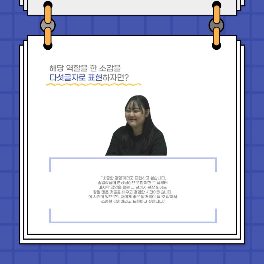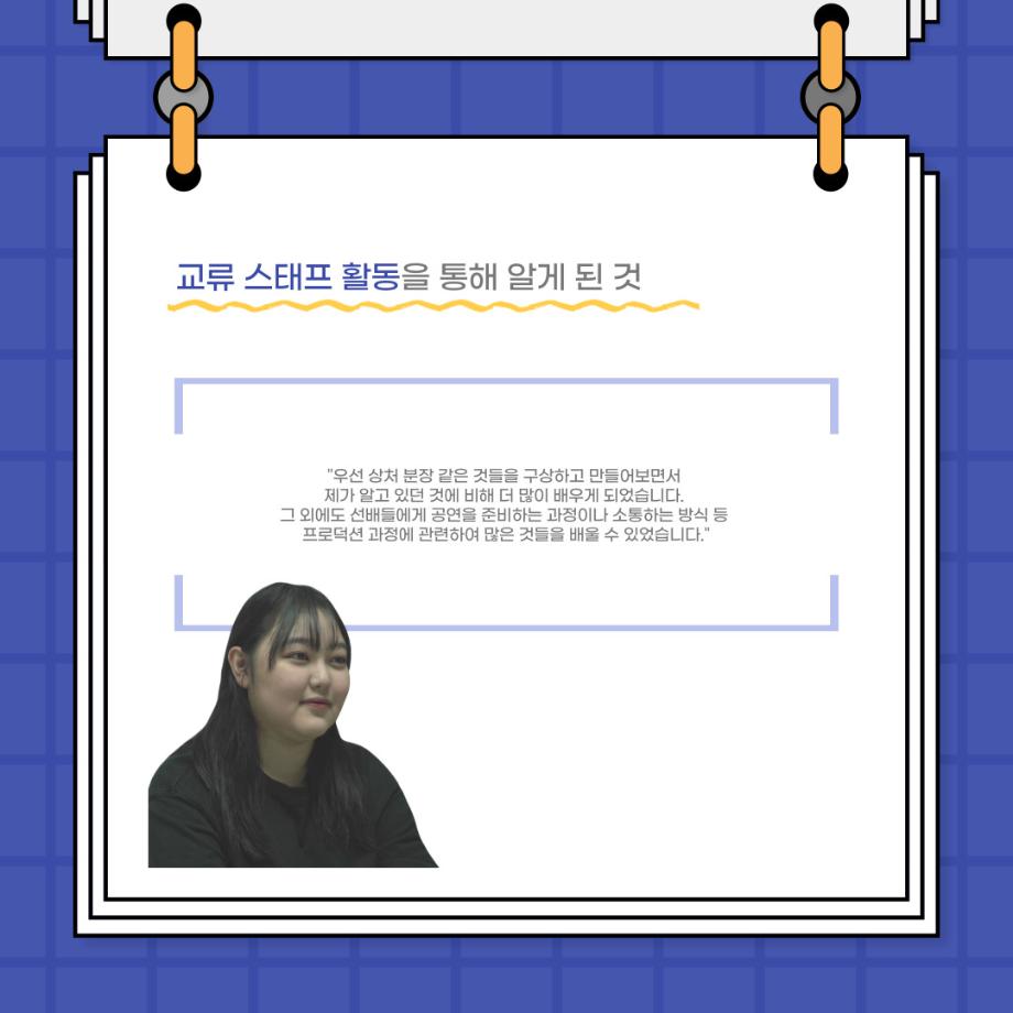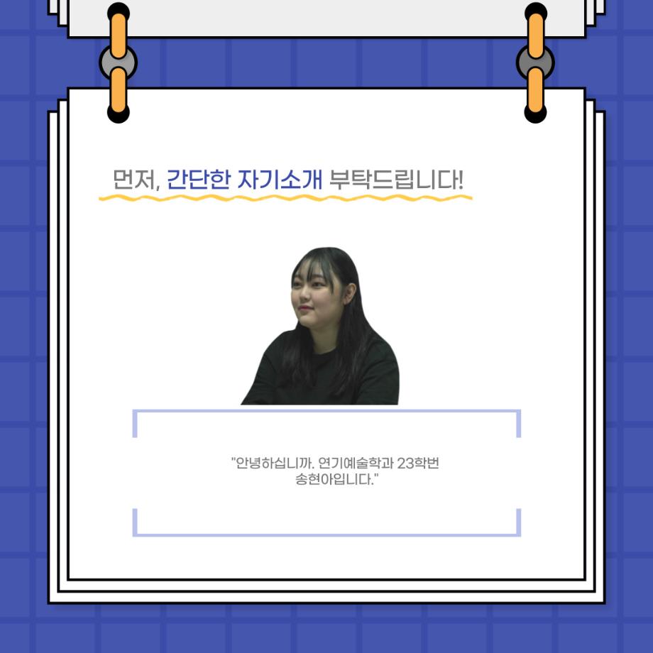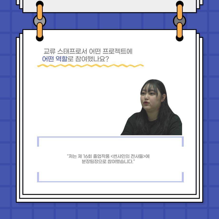 본문 시작 홈으로 커뮤니티 학과소개 입학정보 교수소개 학과과정 커뮤니티 공연예매 안내 홈페이지가이드 포토갤러리 공지사항 포토갤러리 작품DB 동아리 학사일정 학생회 포토갤러리 페이스북 트위터 프린트 사이와의 인터뷰 - 23년도 졸업작품 - 교류스탭 분장팀장 ‘송현아’ 연기예술학과 3079 2024-02-12 안녕하십니까. 23년도 학회 ‘사이’입니다. 학회 ‘사이’의 스물네 번째 인터뷰로 연기예술학과 23년도 졸업작품 <썬샤인의 전사들>에서 교류 스탭으로 참여한 송현아 학생과 인터뷰하는 시간을 가졌습니다. 이번 인터뷰에서는 졸업작품 <썬샤인의 전사들> 교류 스탭으로 참여하면서 알게 된 것, 재미있었던 일화, 공연 봤을 때의 기분 등에 대해 인터뷰하였습니다. 다음 인터뷰 컨텐츠 ‘사인’도 많은 사랑 부탁드립니다. 목록 이전사이와의 인터뷰 - 23년도 졸업작품 - 교류스탭 조연출 ‘허승혁’ 다음 연기예술학과 103회 정기공연 동계 프로젝트 <올모스트 메인> 프로필 스틸컷 담당부서 : 연기예술학과 담당자 : - 연락처 : 043-649-1733 최종수정일 : 2024-10-26 만족도조사 만족도 조사 이 페이지에서 제공하는 정보에 대하여 만족하시나요? 매우만족 만족 보통 불만족 매우불만족