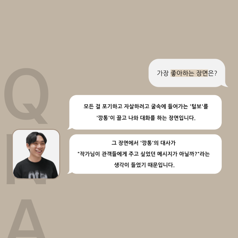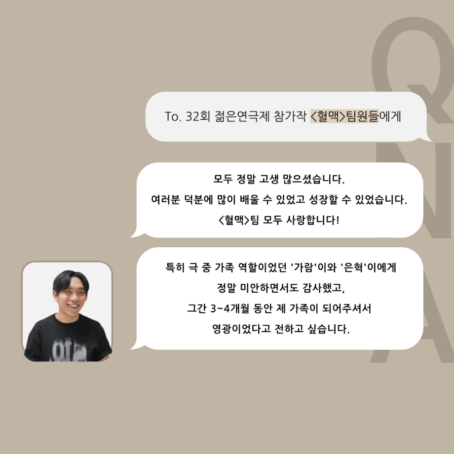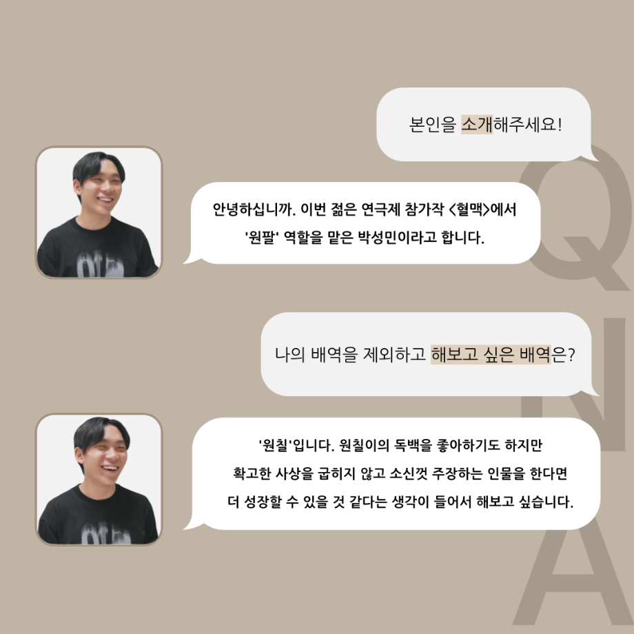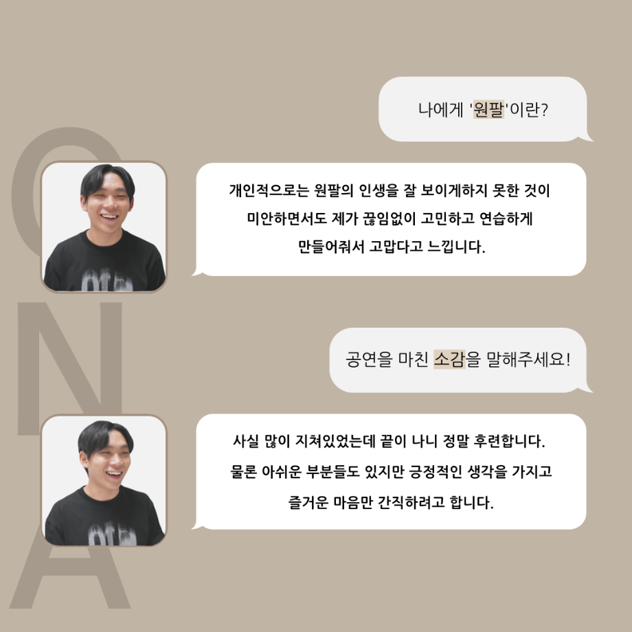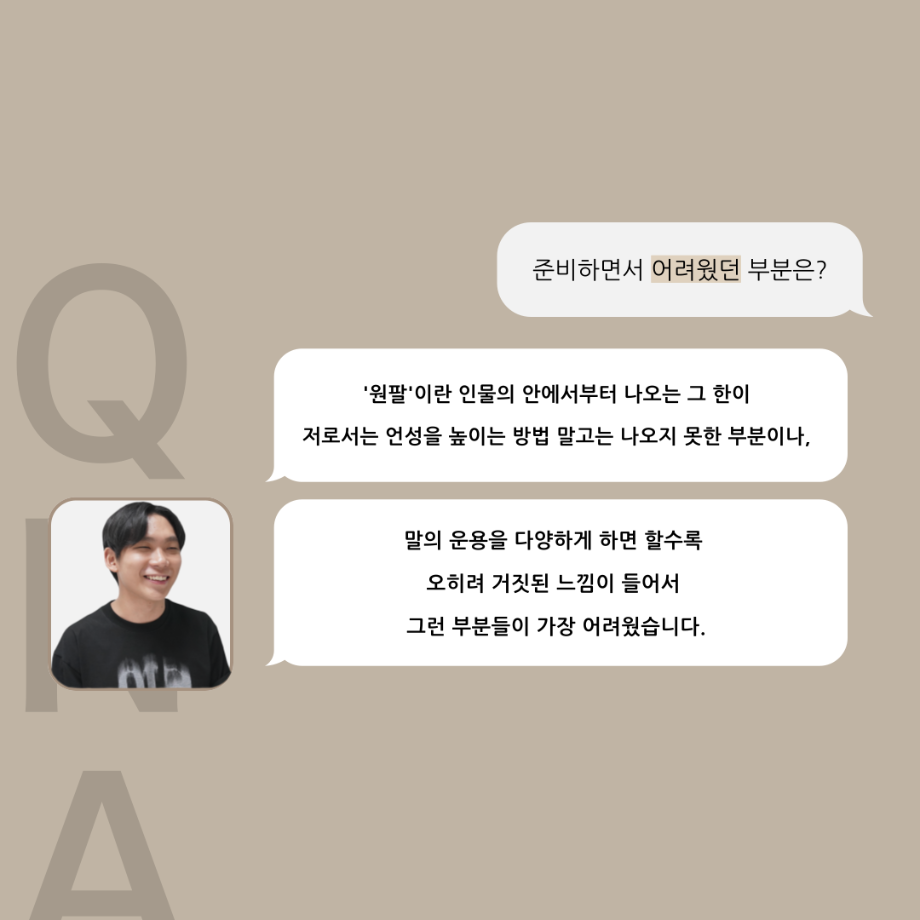 본문 시작 홈으로 커뮤니티 학과소개 입학정보 교수소개 학과과정 커뮤니티 공연예매 안내 홈페이지가이드 포토갤러리 공지사항 포토갤러리 작품DB 동아리 학사일정 학생회 포토갤러리 페이스북 트위터 프린트 ‘품’위있는 인‘터뷰’ - 24년도 젊은연극제 원팔役 <박성민> 연기예술학과 3335 2024-08-09 안녕하십니까. 24년도 학회 ‘품’ 입니다. 학회 ‘품’의 열 한 번째 인터뷰로 세명대학교 연기예술학과 24학년도 젊은연극제 참가작 <혈맥> 원팔 역인 박성민 학우와 인터뷰 하는 시간을 가졌습니다. 가장 좋아하는 장면, 자신의 배역을 제외하고 해보고 싶은 배역 그리고 준비하면서 어려웠던 부분과 공연을 마친 소감 등에 대해 인터뷰 하는 시간을 가졌습니다. 앞으로 있을 인터뷰 컨텐츠인 ‘품터뷰’ 많은 사랑 부탁드립니다. 목록 이전'품'위있는 인'터뷰' - 24년도 젊은연극제 학생 연출 <오승아> 다음 제6회 세명진로 Festival 대면 특강 안내 담당부서 : 연기예술학과 담당자 : - 연락처 : 043-649-1733 최종수정일 : 2024-10-26 만족도조사 만족도 조사 이 페이지에서 제공하는 정보에 대하여 만족하시나요? 매우만족 만족 보통 불만족 매우불만족