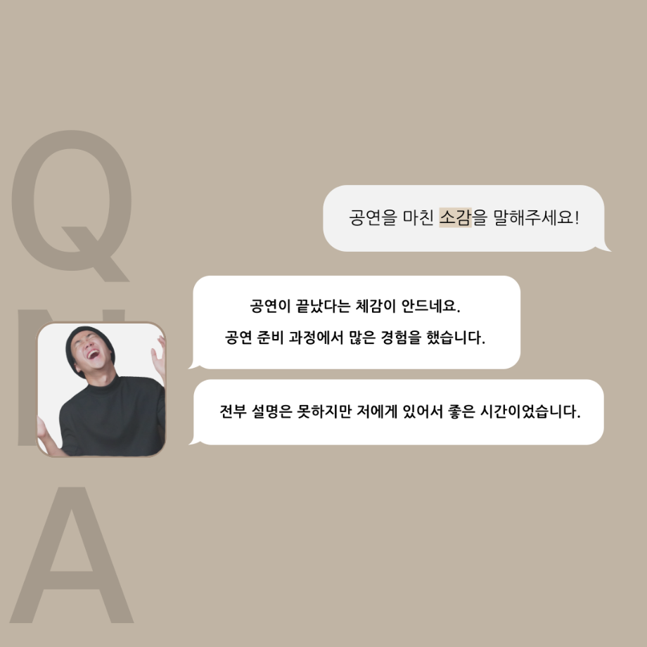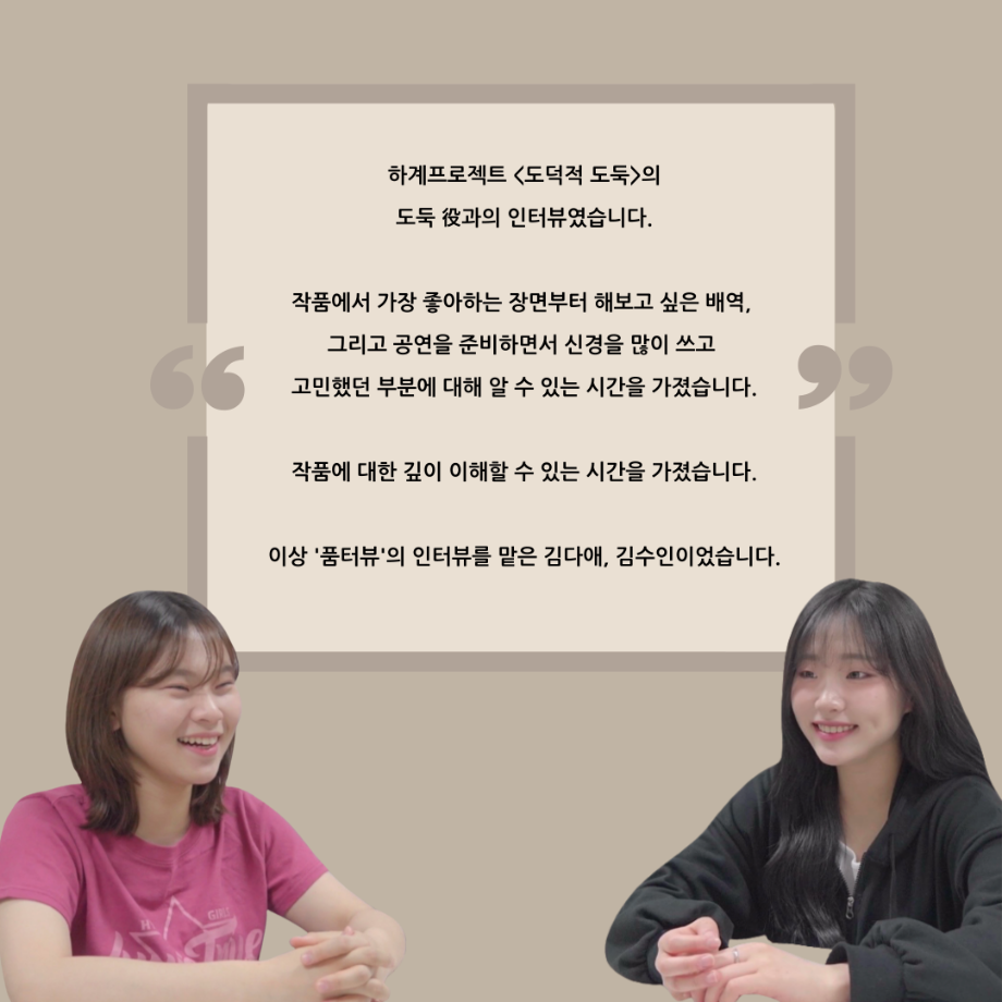본문 시작 홈으로 커뮤니티 학과소개 입학정보 교수소개 학과과정 커뮤니티 공연예매 안내 홈페이지가이드 포토갤러리 공지사항 포토갤러리 작품DB 동아리 학사일정 학생회 포토갤러리 페이스북 트위터 프린트 ‘품’위있는 인‘터뷰’ - 하계프로젝트 도둑役 <박상훈> 연기예술학과 3175 2024-09-13 안녕하십니까. 24년도 학회 ‘품’ 입니다. 학회 ‘품’의 열 네 번째 인터뷰로 세명대학교 연기예술학과 하계프로젝트 <도덕적 도둑> 의 도둑 역인 박상훈 학우와 인터뷰 하는 시간을 가졌습니다. 가장 좋아하는 장면, 자신의 배역을 제외하고 해보고 싶은 배역 그리고 준비하면서 어려웠던 부분과 공연을 마친 소감 등에 대해 인터뷰 하는 시간을 가졌습니다. 앞으로 있을 인터뷰 컨텐츠인 ‘품터뷰’ 많은 사랑 부탁드립니다. 목록 이전논문통계분석 LIVE 특강 안내 다음 ‘품’위있는 인‘터뷰’ - 하계프로젝트 안토니오役 <정준혁> 담당부서 : 연기예술학과 담당자 : - 연락처 : 043-649-1733 최종수정일 : 2024-10-26 만족도조사 만족도 조사 이 페이지에서 제공하는 정보에 대하여 만족하시나요? 매우만족 만족 보통 불만족 매우불만족
