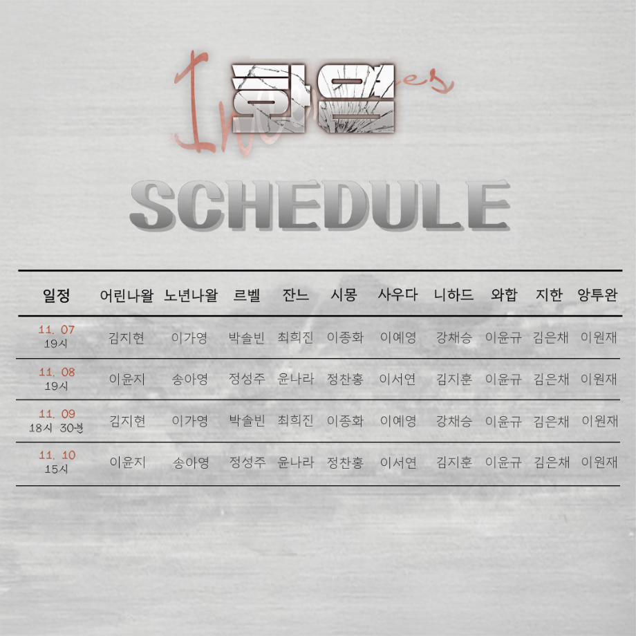 본문 시작 홈으로 커뮤니티 학과소개 입학정보 교수소개 학과과정 커뮤니티 공연예매 안내 홈페이지가이드 포토갤러리 공지사항 포토갤러리 작품DB 동아리 학사일정 학생회 포토갤러리 페이스북 트위터 프린트 제 17회 세명대학교 연기예술학과 졸업작품 <화염> 스케줄표 연기예술학과 3174 2024-11-06 우리 함께 있으니, 모든게 나아질거야. - 공연일시 A CAST 11.08(금) 19:00 11.10(일) 15:00 B CAST 11.07(목) 19:00 11.09(토) 18:30 서울 대학로 민송아트홀 1관 목록 이전제 17회 세명대학교 연기예술학과 졸업작품 <화염> 포스터 & 캐스트 다음 2024학년도 집단심층토의FGI“세명톡톡TALK TALK” 참여자 모집 담당부서 : 연기예술학과 담당자 : - 연락처 : 043-649-1733 최종수정일 : 2024-10-26 만족도조사 만족도 조사 이 페이지에서 제공하는 정보에 대하여 만족하시나요? 매우만족 만족 보통 불만족 매우불만족