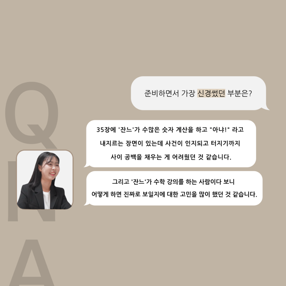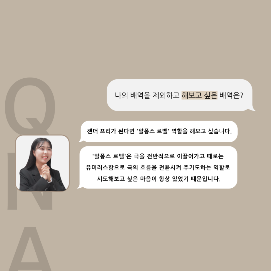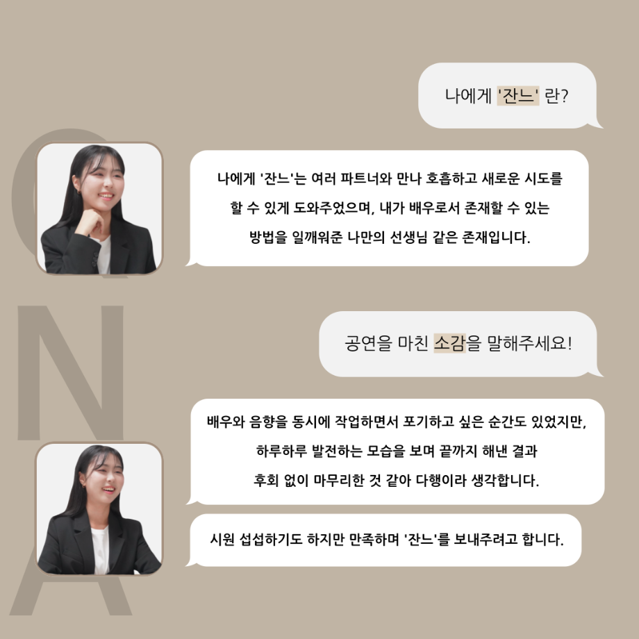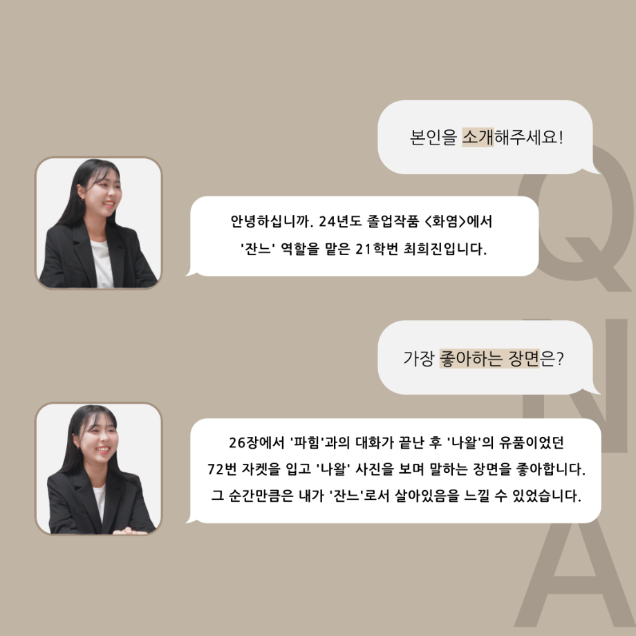본문 시작 홈으로 커뮤니티 학과소개 입학정보 교수소개 학과과정 커뮤니티 공연예매 안내 홈페이지가이드 포토갤러리 공지사항 포토갤러리 작품DB 동아리 학사일정 학생회 포토갤러리 페이스북 트위터 프린트 ‘품’위있는 인‘터뷰’ - 24년도 졸업작품 잔느 役 <최희진> 연기예술학과 3352 2024-12-23 안녕하십니까. 24년도 학회 ‘품’ 입니다. 학회 ‘품’의 열 아홉 번째 인터뷰로 세명대학교 연기예술학과 제 17회 졸업작품 <화염>의 잔느 역인 최희진 학우와 인터뷰 하는 시간을 가졌습니다. 가장 좋아하는 장면, 자신의 배역을 제외하고 해보고 싶은 배역 그리고 준비하면서 어려웠던 부분과 공연을 마친 소감 등에 대해 인터뷰 하는 시간을 가졌습니다. 앞으로 있을 인터뷰 컨텐츠인 ‘품터뷰’ 많은 사랑 부탁드립니다. 목록 이전‘품’위있는 인‘터뷰’ - 24년도 졸업작품 르벨 役 <정성주> 다음 ‘품’위있는 인‘터뷰’ - 24년도 졸업작품 시몽 役 <이종화> 담당부서 : 연기예술학과 담당자 : - 연락처 : 043-649-1733 최종수정일 : 2024-10-26 만족도조사 만족도 조사 이 페이지에서 제공하는 정보에 대하여 만족하시나요? 매우만족 만족 보통 불만족 매우불만족