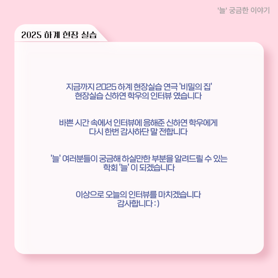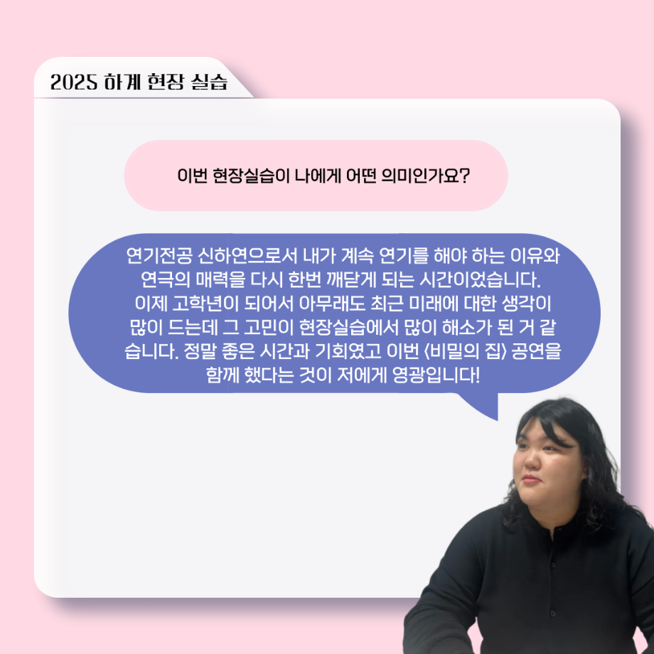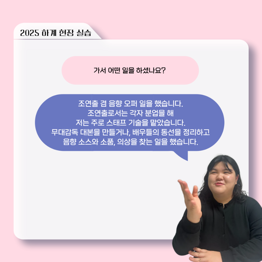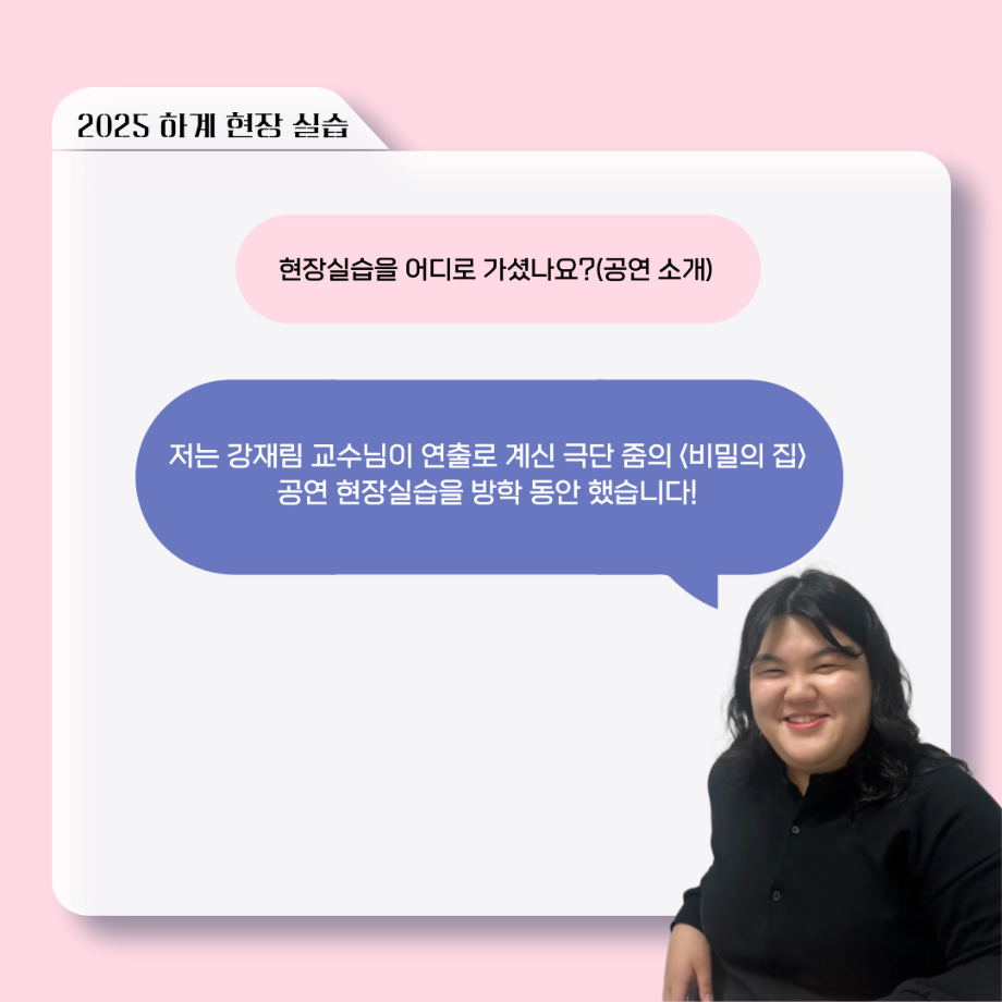 본문 시작 홈으로 커뮤니티 학과소개 입학정보 교수소개 학과과정 커뮤니티 공연예매 안내 홈페이지가이드 포토갤러리 공지사항 포토갤러리 작품DB 동아리 학사일정 학생회 포토갤러리 페이스북 트위터 프린트 ‘늘‘ 궁금한 이야기 - 현장실습 < 신하연 > 연기예술학과 953 2025-10-16 . 목록 이전117회 세명대학교 연기예술학과 하계프로젝트 사랑의 온도 배우 소개 다음 ‘늘‘ 궁금한 이야기 - 하계 프로젝트 ‘컨택’팀 고진役 < 조진석 > 담당부서 : 연기예술학과 담당자 : - 연락처 : 043-649-1733 최종수정일 : 2024-10-26 만족도조사 만족도 조사 이 페이지에서 제공하는 정보에 대하여 만족하시나요? 매우만족 만족 보통 불만족 매우불만족