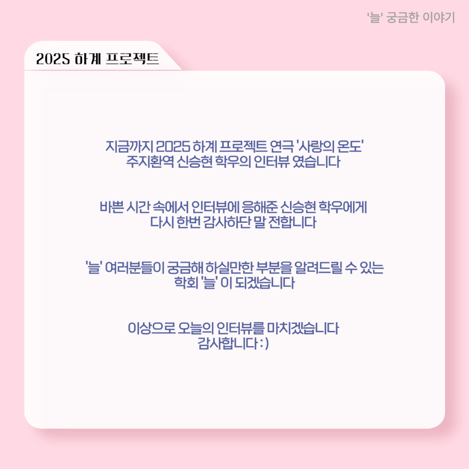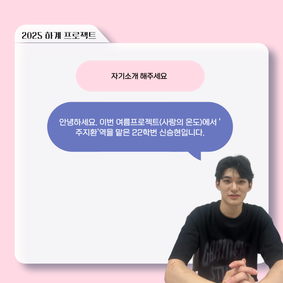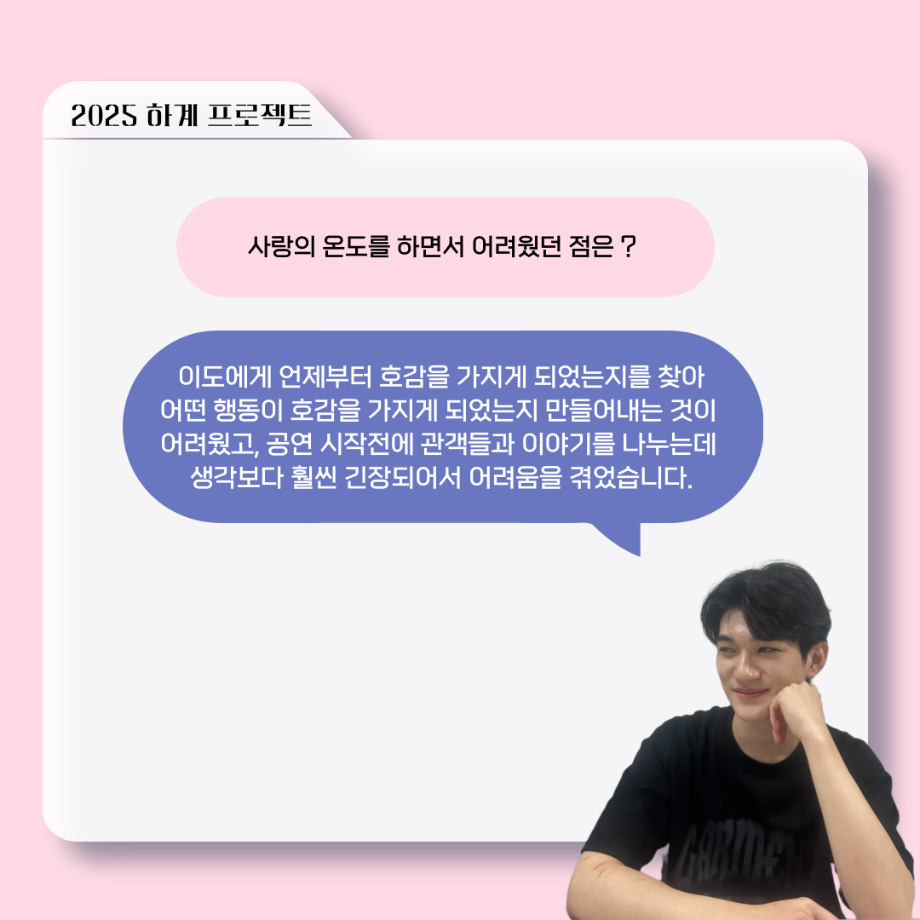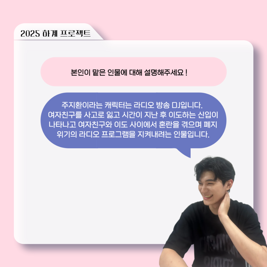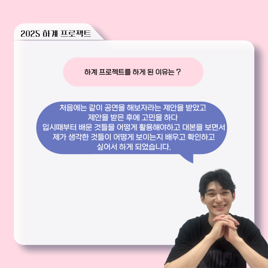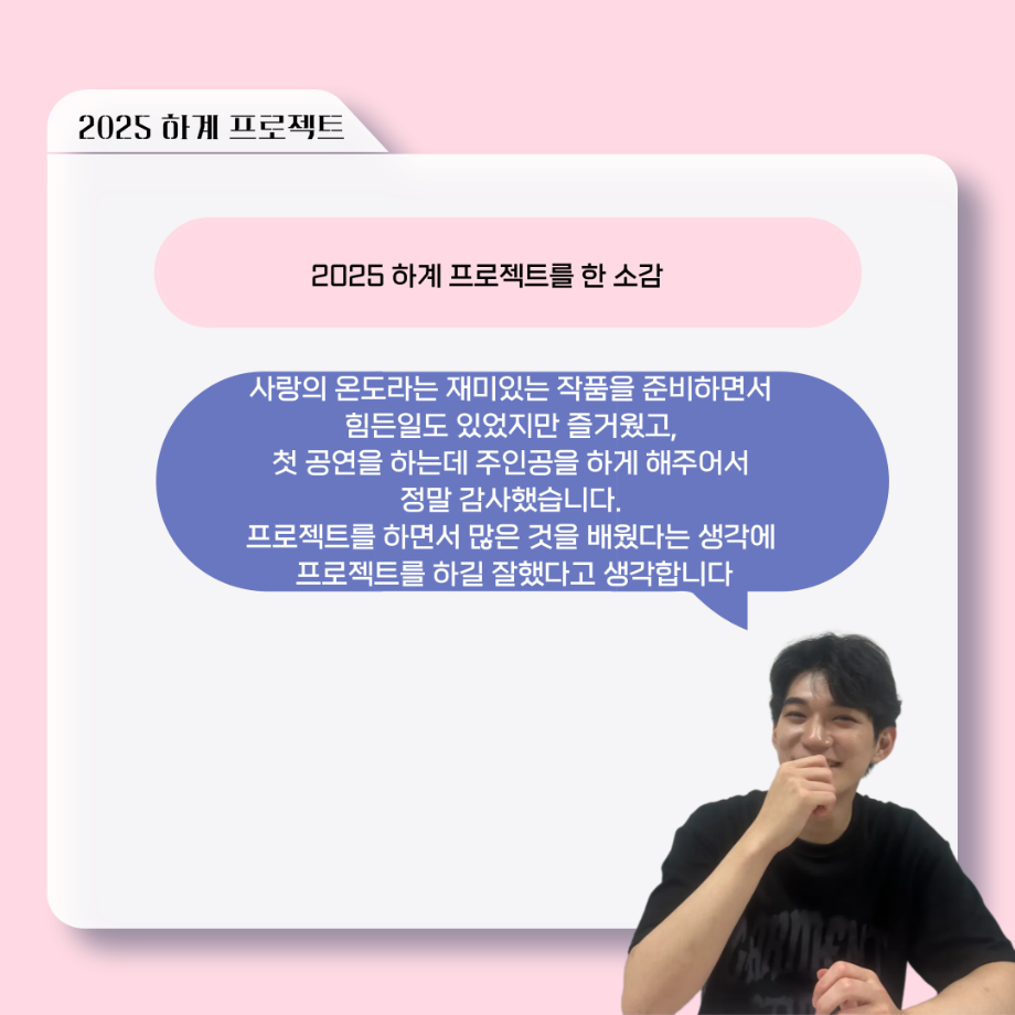 본문 시작 홈으로 커뮤니티 학과소개 입학정보 교수소개 학과과정 커뮤니티 공연예매 안내 홈페이지가이드 포토갤러리 공지사항 포토갤러리 작품DB 동아리 학사일정 학생회 포토갤러리 페이스북 트위터 프린트 ‘늘‘ 궁금한 이야기 - 하계 프로젝트 ‘사랑의 온도’팀 주지환役 < 신승현 > 연기예술학과 1096 2025-11-11 . 목록 이전‘늘‘ 궁금한 이야기 - 하계 프로젝트 ‘사랑의 온도’팀 서이도役 < 함유진 > 다음 ‘늘‘ 궁금한 이야기 - 2025 졸업작품 ‘유랑극장’ 노풍찬役 < 김은혁 > 담당부서 : 연기예술학과 담당자 : - 연락처 : 043-649-1733 최종수정일 : 2024-10-26 만족도조사 만족도 조사 이 페이지에서 제공하는 정보에 대하여 만족하시나요? 매우만족 만족 보통 불만족 매우불만족