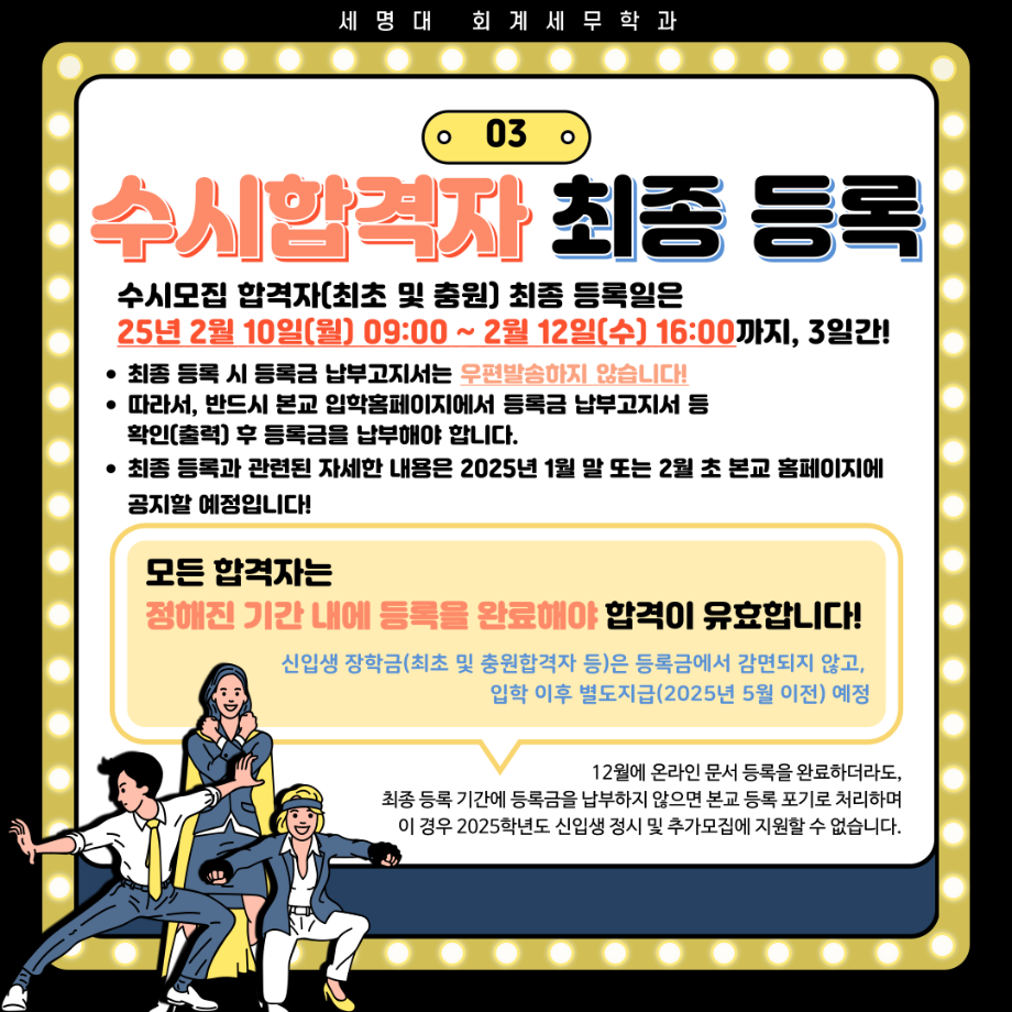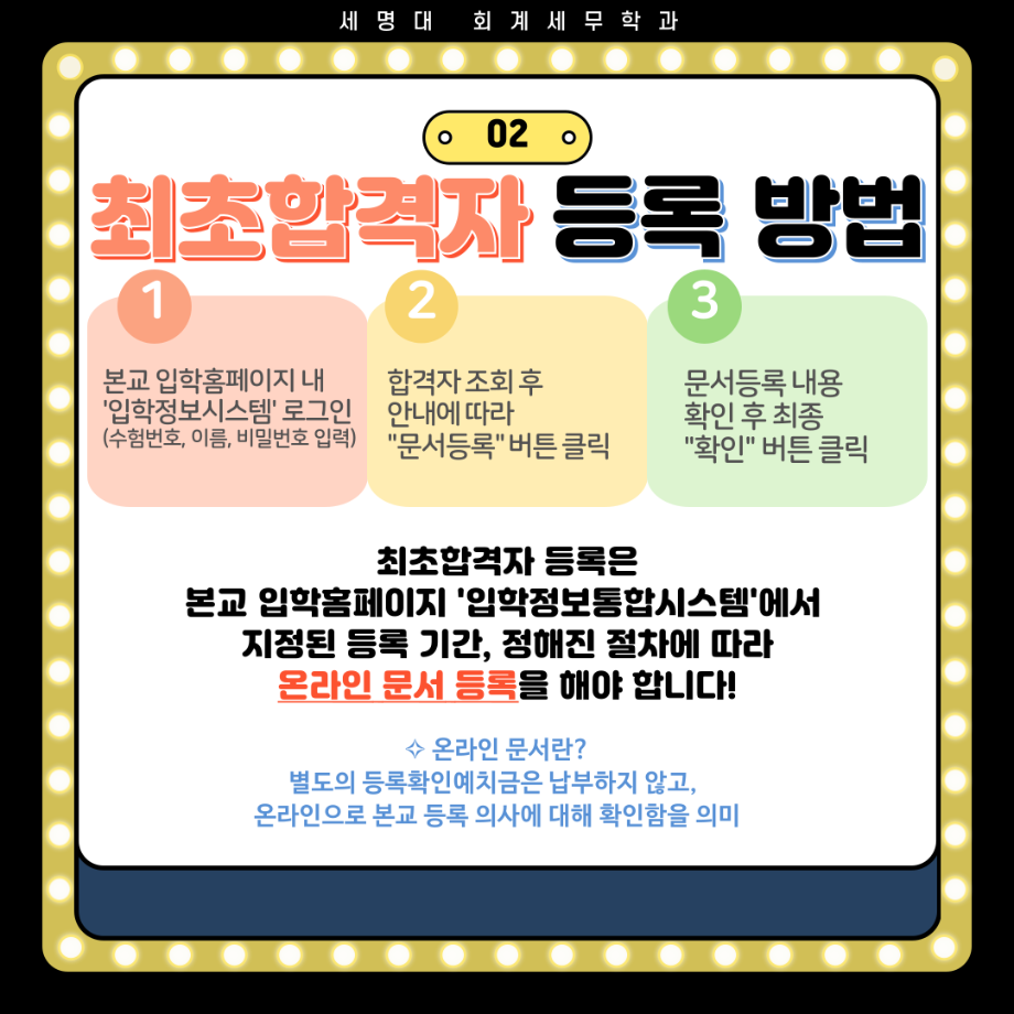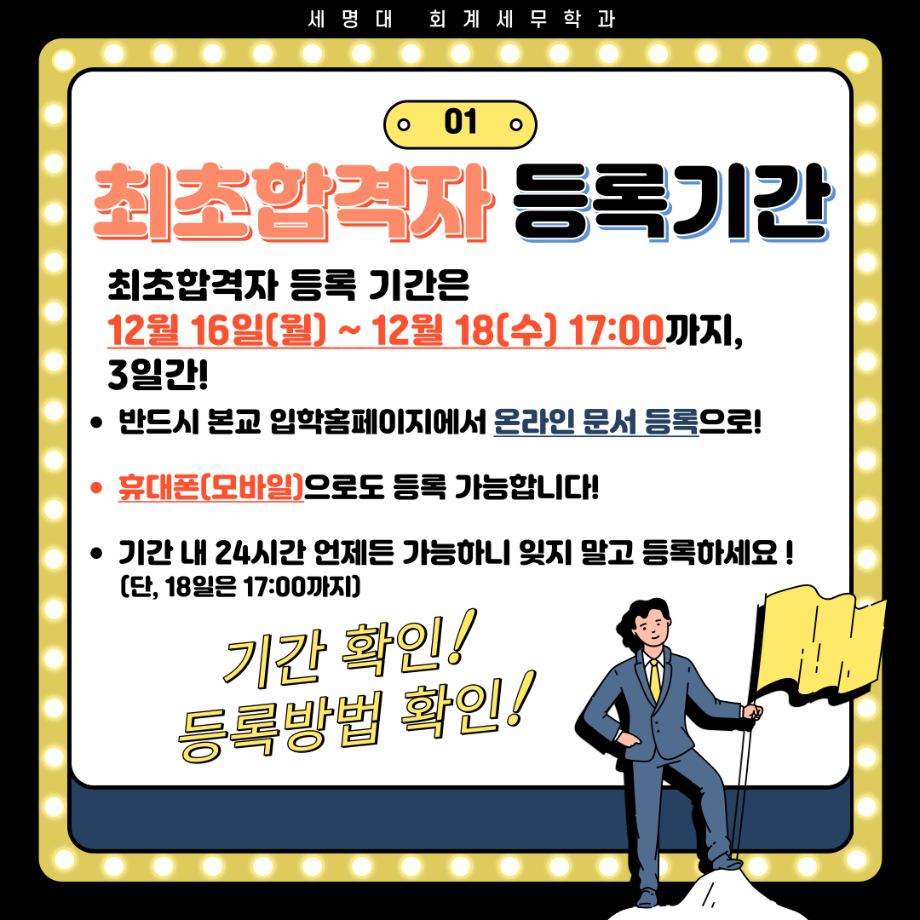 본문 시작 홈으로 학과소식 학과소개 취업정보 교육과정 학과소식 홈페이지가이드 포토갤러리 공지사항 포토갤러리 학과이야기 학과행사 포토갤러리 페이스북 트위터 프린트 2025학년도 수시모집 최초합격자 등록 안내 회계세무학과 1666 2024-12-16 2025 학년도 수시모집 최초합격자 등록 안내사항입니다. 목록 이전12월 학사일정 다음 [알쓸신잡_2025년 01월 3주차] ●취업 및 일자리 정보 제공 안내문● 담당부서 : 회계세무학과 담당자 : - 연락처 : 043-649-1244 최종수정일 : 2024-10-26 만족도조사 만족도 조사 이 페이지에서 제공하는 정보에 대하여 만족하시나요? 매우만족 만족 보통 불만족 매우불만족