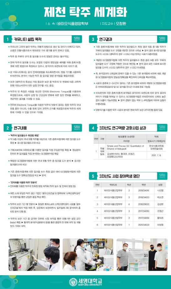 본문 시작 홈으로 커뮤니티 학부소개 진로·취업 교육과정 커뮤니티 대학원 입학상담 홈페이지가이드 갤러리 공지사항 갤러리 학생회 동문회 전공자료실 전공동아리 Youtube Instagram 갤러리 페이스북 트위터 프린트 2021 대학혁신지원사업 - 3차년도 연구역량 강화세미나 바이오식품영양학부 2413 2021-12-06 2021년 12월 2일 진행된 "2021 대학혁신지원사업 - 3차년도 연구역량 강화세비나"에 오창환 교수가 진행한 "제천탁주세계화"의 결과를 3학년 나선영 학생이 발표하였습니다. 목록 이전2021 실험조리 교과 수익금_학과 발전기금으로 기부 다음 바이오식품산업학부 학술제 및 메디푸드랜선조리경연대회 시상식 담당부서 : 바이오식품영양학부 담당자 : - 연락처 : 043-649-1430 최종수정일 : 2024-10-26 만족도조사 만족도 조사 이 페이지에서 제공하는 정보에 대하여 만족하시나요? 매우만족 만족 보통 불만족 매우불만족