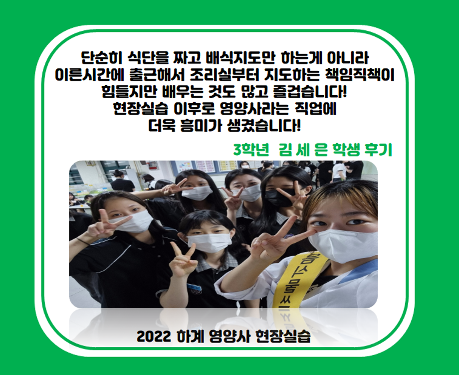 본문 시작 홈으로 커뮤니티 학부소개 진로·취업 교육과정 커뮤니티 대학원 입학상담 홈페이지가이드 갤러리 공지사항 갤러리 학생회 동문회 전공자료실 전공동아리 Youtube Instagram 갤러리 페이스북 트위터 프린트 2022 하계영양사 현장실습(동일여자고등학교) 바이오식품영양학부 1984 2022-07-13 목록 이전2022 하계영양사 현장실습(제천시청) 다음 2022 하계영양사 현장실습(목원푸드 코레일 승무원기숙식당) 담당부서 : 바이오식품영양학부 담당자 : - 연락처 : 043-649-1430 최종수정일 : 2024-10-26 만족도조사 만족도 조사 이 페이지에서 제공하는 정보에 대하여 만족하시나요? 매우만족 만족 보통 불만족 매우불만족